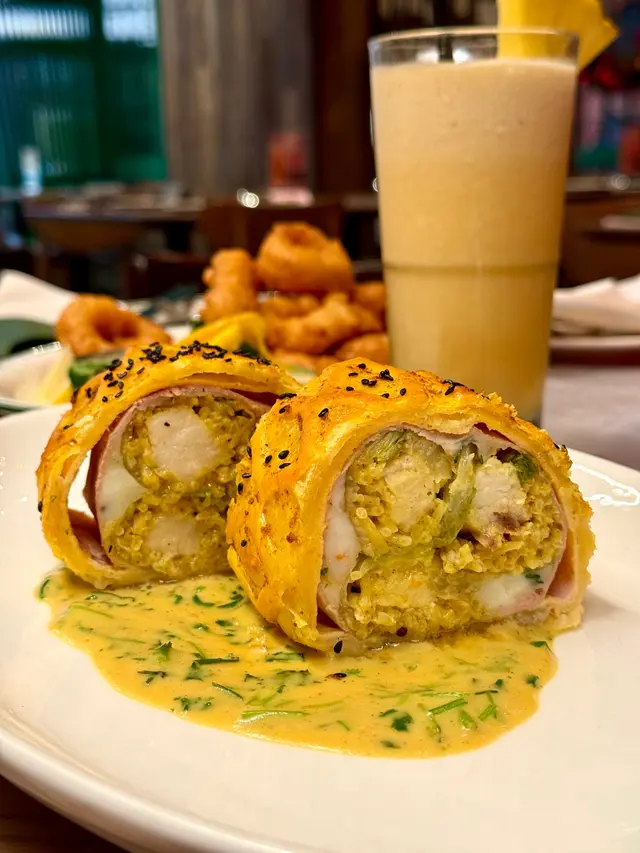 餐廳裝修充滿時尚復古風,好適合打卡!更設有户外花園酒吧,露天座位好適合和朋友一起暢飲,感覺更悠閒寫意。.🔸Swordfish Wellington $268每日限量供應的劍魚柳威靈頓外層酥香,魚肉嫩滑,入面還有咖喱椰香飯、蔬菜等,口感層次豐富,配上咖喱牛油汁更美味。.🔹Barbeque Chicken $188薄餅分量十足,餅皮酥脆,上面放滿烤雞肉、黑醋洋蔥、烤紅椒,再配上三種芝士,令味道更香濃惹味。.🔸Homemade Rotolo Pasta (V) $178第一次品嚐手工旋渦麵,入面包著香甜的烤奶油瓜、鮮爽菠菜、羊奶芝士,味道充滿清香。.🔹Beer Battered Squid $98炸魷魚新鮮炸起好香脆,彈牙鮮美,配上香草蛋黃醬,味道更提升。.🔸Virgin Peach Colada $58椰奶香十足,口感順滑,配上鳳梨、蜜桃泥,帶淡淡清新果香。.🔹Mooolmonade $58造型充滿中西合璧,以柚子、冬瓜、檸檬整成,層次豐富,清爽不甜膩。…查看更多