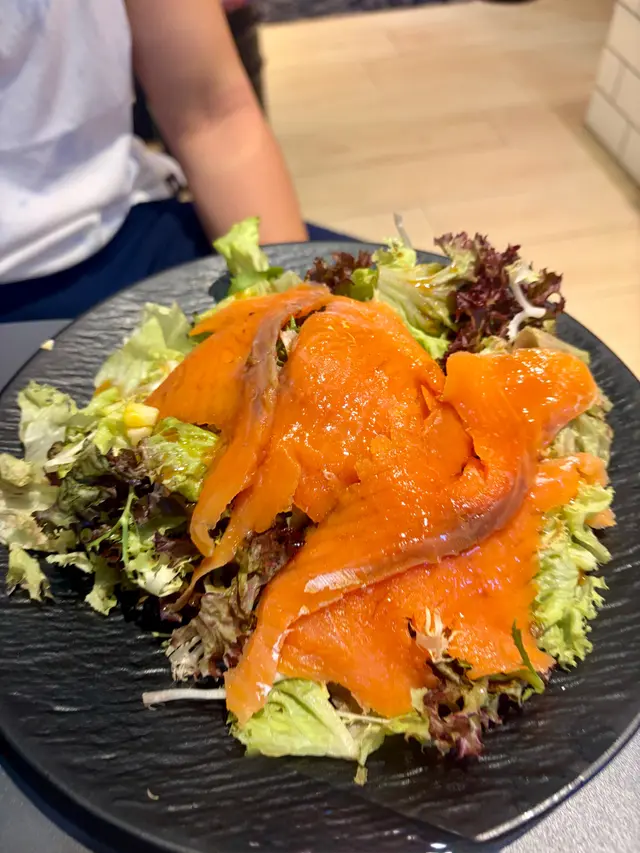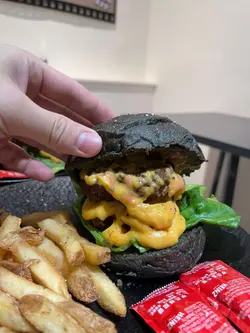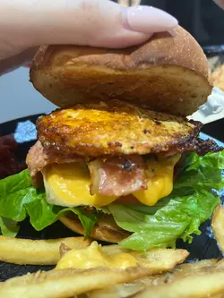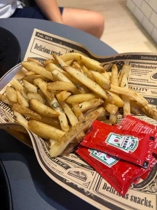 手打牛肉漢堡~熱騰騰端上枱已覺吸引,配粗薯條,小小辣粉,質感夠鬆脆,喜歡食店用包裝茄汁,相當夠衛生。手打牛肉漢堡扒有肉味,未算大咸,有生菜,番茄、芥末醬,美味吸引,漢堡的包,包有明顯地烘過,暖暖的,正!薯條係筆者最愛的粗薯條,有少少的辣粉,喜歡他們用獨立包裝的茄汁,感覺乾淨啲。