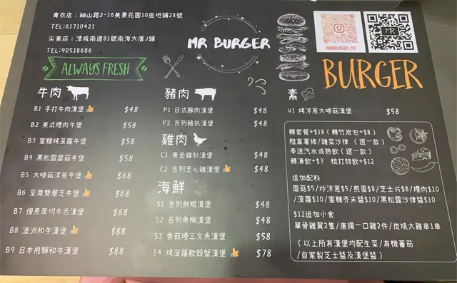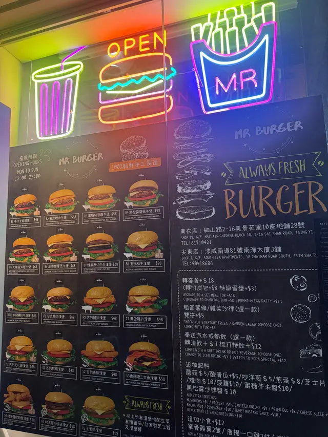 MR Burger (尖沙咀) 網址: https://s.openrice.com/QrbS0zQ47W0 地址: 香港尖沙咀漆咸道南81號南海大廈地下J號舖 電話: +852 90518686
