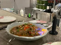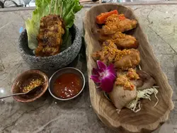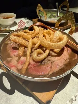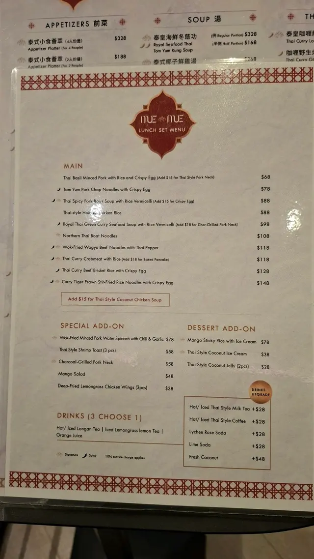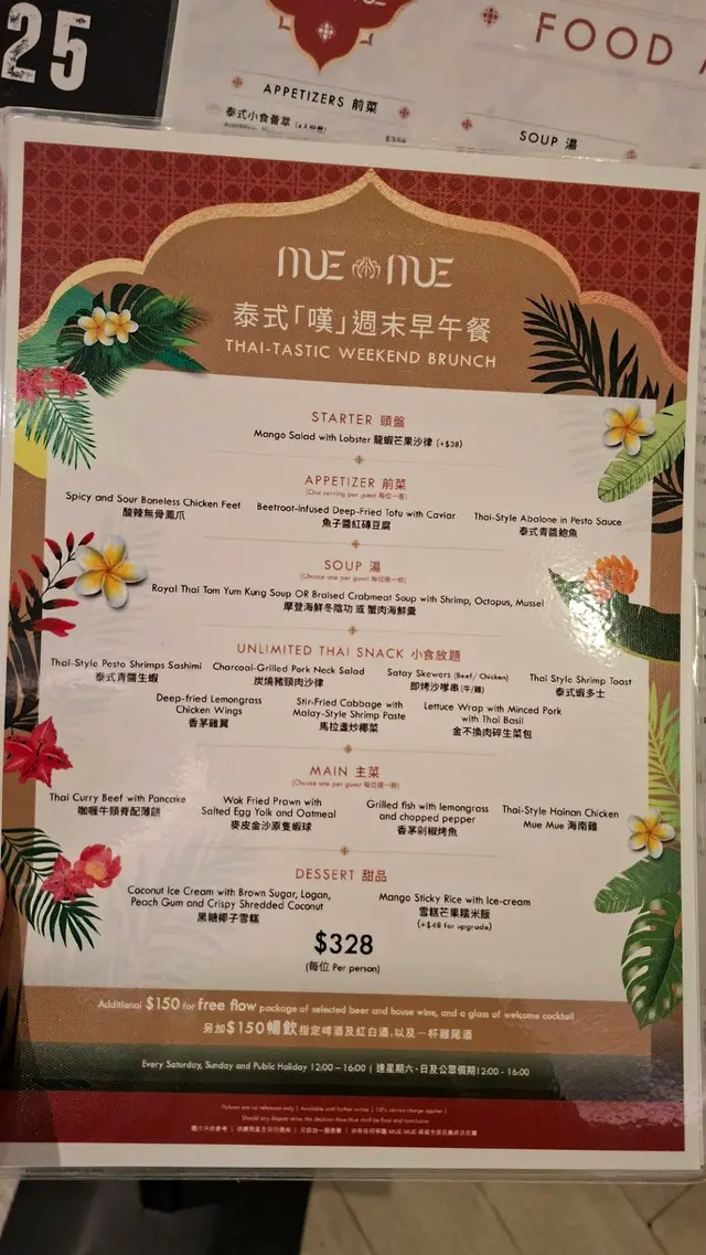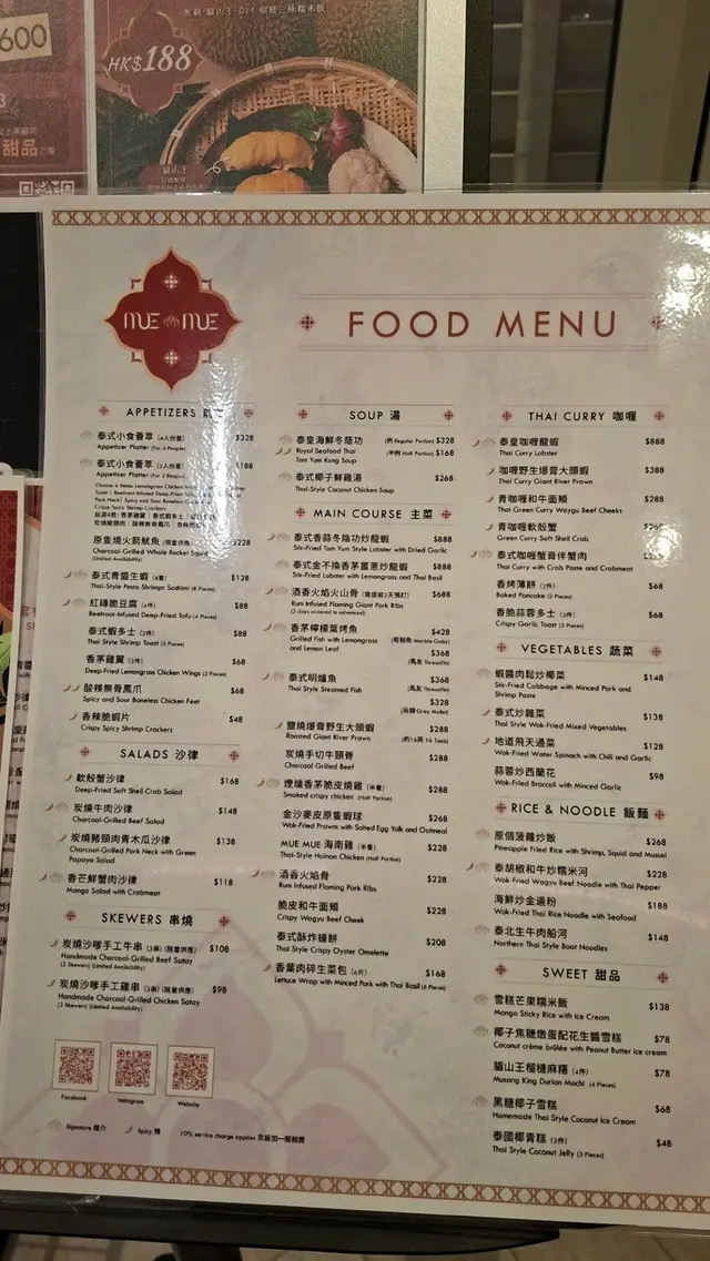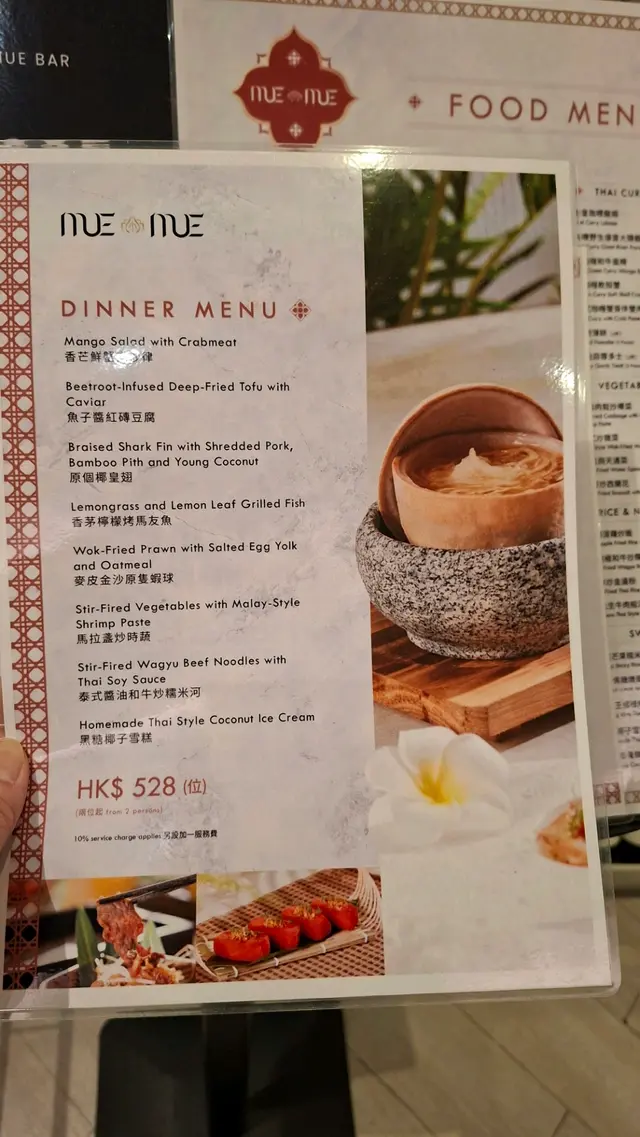 餐廳位於Mira place 3樓,霸咗差唔多大半層位置,所以坐得好闊落,裝修燈光偏暗,多人仲有包廂坐,係高級餐廳嘅感覺😆呢間mue mue算係高檔嘅泰菜,所以都好放心試試佢吧泰式生蝦,配埋靈魂綠色海鮮辣醬,勁正!食住生蝦,再飲返一啖海鮮冬陰功湯,熱辣辣暖返個胃😋👍🏻酸甜好開胃,有好大隻蝦、魷魚、蜆、青口,好足料~青咖喱和牛面珠墩,整得非常軟糯,膠質等得好淋😋啲肉又唔會好鬆散,果然係和牛嘅質素🤭泰國菜最出名嘅當然唔少得船河,配埋和牛肉,滋味更上一層樓😄面質煙韌,個湯夠熱,和牛好香,喋喋餸都勁大兜,物超所值😆😆最後仲有一個香茅煙燻雞⋯勁大隻!個皮真係整得好脆好脆😍😍唔食肉都要食晒啲皮😋每碟餸嘅份量都比得好足,兩個人真係完全食唔晒🥹但係樣樣都咁好食,所以要捧住個肚走🤣🤣最後用要叫咗一個椰子焦糖燉蛋配花生醬雪糕🍦 鍾意食花生嘅你一定唔可以錯過,喺超濃郁嘅花生味,好似食緊花生湯圓😙😙美麗華又近地鐵站,會係我行街之後嘅餐廳好選擇之一🥰…查看更多