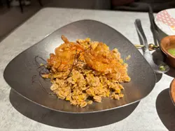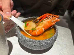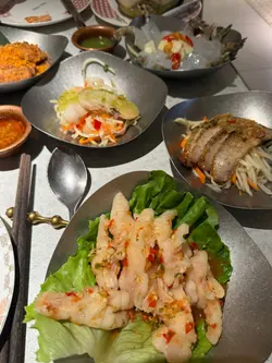 餐廳位於Mira place 3樓,霸咗差唔多大半層位置,所以坐得好闊落,裝修燈光偏暗,多人仲有包廂坐,係高級餐廳嘅感覺😆呢間mue mue算係高檔嘅泰菜,所以都好放心試試佢吧泰式生蝦,配埋靈魂綠色海鮮辣醬,勁正!食住生蝦,再飲返一啖海鮮冬陰功湯,熱辣辣暖返個胃😋👍🏻酸甜好開胃,有好大隻蝦、魷魚、蜆、青口,好足料~青咖喱和牛面珠墩,整得非常軟糯,膠質等得好淋😋啲肉又唔會好鬆散,果然係和牛嘅質素🤭泰國菜最出名嘅當然唔少得船河,配埋和牛肉,滋味更上一層樓😄面質煙韌,個湯夠熱,和牛好香,喋喋餸都勁大兜,物超所值😆😆最後仲有一個香茅煙燻雞⋯勁大隻!個皮真係整得好脆好脆😍😍唔食肉都要食晒啲皮😋每碟餸嘅份量都比得好足,兩個人真係完全食唔晒🥹但係樣樣都咁好食,所以要捧住個肚走🤣🤣最後用要叫咗一個椰子焦糖燉蛋配花生醬雪糕🍦 鍾意食花生嘅你一定唔可以錯過,喺超濃郁嘅花生味,好似食緊花生湯圓😙😙美麗華又近地鐵站,會係我行街之後嘅餐廳好選擇之一🥰…查看更多