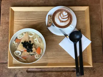 十二野菜咖哩飯 veggie curry rice 🥦🍆 ($95) 厚燒玉子味噌烏冬 udon in miso soup with tamagoyaki ($48)忌廉芝士貝果 bagel w/ cream cheese🧀 ($30).發覺好耐冇po過主食/正餐😂.N年也不來一次的黃竹坑,沒想到竟然有咁多cafe!!今日D小姐帶我黎到呢間cafe,cafe行工業風的開揚設計,落地玻璃和木材傢私令店內環境開揚舒適:).朋友點左咖喱野菜飯🍛日式咖哩同野菜的配搭,有仿如住家菜的小清新和美味~.不過小編認為茶餐時段的性價比更高,於是等到3點才點茶餐🙈點了一款烏冬和一款bagel,烏冬雖然沒有很驚豔的味道,卻很有住家菜的風味,湯底是比較清的味噌湯,不會蓋過腐皮和玉子燒的甜,而且份量也不少呢!貝果是歐美的吃法:附上忌廉芝士自己塗,特別喜歡微烘後脆皮的口感😍.總括而言,沒想到作為veggie cafe🥗,餐牌選擇都可以如此豐富,即使不是素食者也會滿足的cafe,高採光和寬闊的空間也讓人舒適,性價比很高呢!…查看更多