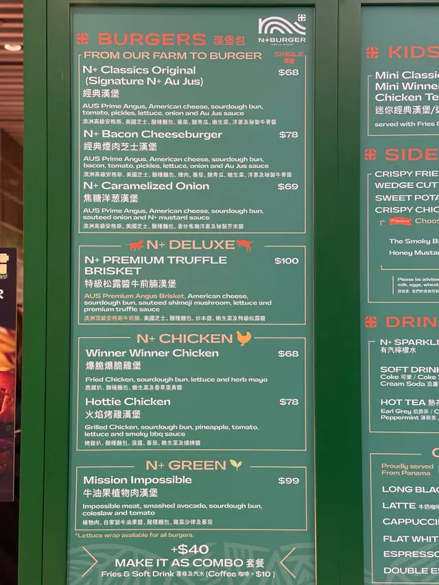 N+ BURGER 製作全天然安格斯牛肉配酸種麵包漢堡。N+ BURGER的牛肉來自於位於新南威爾士州的五個牧場,擁有130,000公頃的原始牧草地,飼養的安格斯黑牛不含任何生長激素(HGP),同時具清真認證,為顧客提供更健康、安全的用餐選擇。