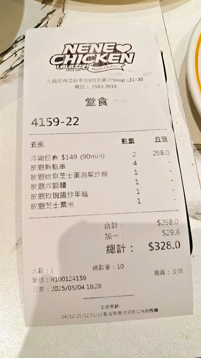 NENE CHICKEN (朗豪坊) (旺角) 網址: https://s.openrice.com/QrbS0Ava700 地址: 香港旺角亞皆老街8號朗豪坊11樓30號舖 電話: +852 35832933