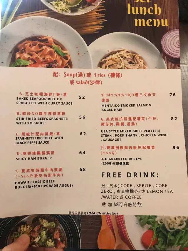 呢間餐廳之前黎過一次嗰次就淨係同朋友黎飲野無食到野一路都想再黎試今次約咗朋友唔知食乜好諗諗下不如就食呢間啦六點九入座無乜人可能仲好早啦一心想食burger 但又驚太寡同唔夠飽最後決定叫一個burger一個linguine share 食呢度逢一至四可以加$24轉set 多個湯同野飲淨係一杯野飲都成三十幾蚊緊係加啦(師奶mode)今晚係忌廉湯 野飲就叫咗百香果梳打湯同野飲都係普通啦不過不失先黎carbonara 個人鍾意linguine 多過spaghettis因為好似可以掛多d汁Carbonara 好似好簡單不過都唔容易整得好味佢個sauce整幾好唔係水nel nel 夠厚亦夠味 入口都好rich 扁意粉煮得時間啱啱好唔會話太硬或太淋而且份量都係可以接受嘅程度主角Angus burger 落單嗰陣有得揀幾成熟我地揀咗7成先講薯條新鮮炸起好熱好脆好味如果再粗身d就再好d添不過由於同沙律菜放埋一齊有部分薯條比個醋浸濕咗淋晒 好可惜一切開一pat黃包野流晒出黎初初仲以為係芝士原來係個honey mustard醬😂😂😂講返個包鬆脆香食得出有處理過食落有啖啖嘅牛油味Angus beef 無想像中咁juicy 比較乾咗少少不過可能因為咁先同個honey mustard 勁夾好好好好輕微嘅芥末味再加少少甜味道比例上好match 再連埋個肉同包同其他配菜一啖咬落去味道豐富之餘又不會話成口油或汁正正正臨走見到隔離枱啱啱上fish and chips 好似都好好味咁下次要試下先得🤔查看更多