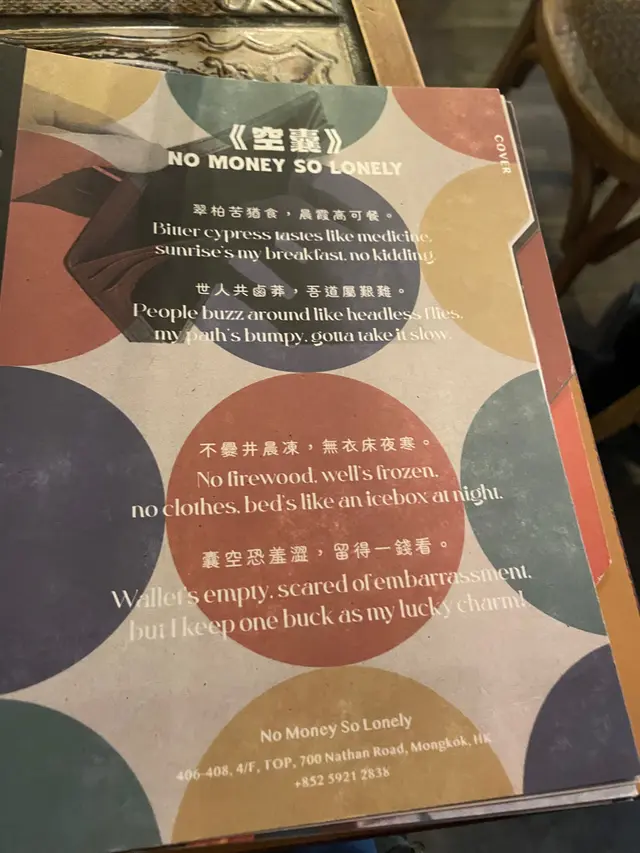 No Money So Lonely (旺角) 網上訂座即賺Rice Dollars 網址: https://s.openrice.com/QrbS08v4A00 地址: 香港旺角彌敦道700號T.O.P This is Our Place 4樓406-408號舖 電話: +852 59212838
