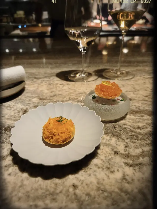 Aji Tartare, clotted cream, egg yolks; Norwegian Trout, Ikura Trout roe