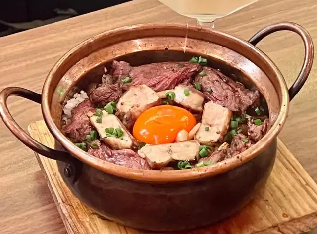 土瓜灣嘅人氣小店,晚上人頭湧湧,如果想來 book位會比較穩陣啲。:)西班牙黑毛豬肋肉日式煲仔飯豬肋骨肉質爽口柔軟唔嚡口,味道唔錯。飯方面,豉油嘅味道調校得啱啱好,唔太鹹唔太甜,淡淡地帶到提升層次嘅作用。飯焦唔會好硬好黐牙。但可能因為佢用嘅係金屬煲,感覺同瓦煲嘅風味 & 香味都係差少少。:)鵝肝澳洲牛封門柳煲仔飯牛柳質感比想像中好,雖然冇咩脂肪,但係都柔嫩易咬,口感幾好。鵝肝煎得太熟一點,但能增加獨有嘅香味。飯嘅質感同上。👌🏼西班牙火腿蜜瓜芝士沙律火腿鹹味較重。沙律係普通沙律雜菜加幾舊蜜瓜,再加埋酸酸甜甜嘅柑橘汁。正常味道。芝士原來只係面頭灑左d 芝士粉。🤔參巴辣蝦醬牛舌牛舌唔係燒,始終風味係爭一點。係煮熟嘅牛舌上面加啲辣醬。味道正常冇咩特別。👌🏼海膽濃蝦湯 同正常龍蝦湯冇分別,食唔到海膽味嘅元素。:)開心果巴斯克流心芝士蛋糕蛋糕質地柔軟,開心果醬味道濃郁,口感同味道都唔錯。:)楊枝甘露拿破崙比起一般嘅芒果拿破崙,真係多咗一浸楊枝甘露嗰種嘅香味。味道唔錯。甜品嘅擺滿都有d 誠意。總結都係一間質量唔錯又有誠意嘅小店。…查看更多