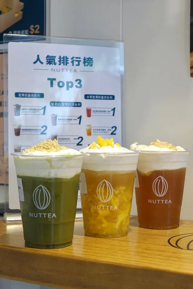 一天一杯手搖飲已經變成許多人不可或缺的日常,特別是「奶蓋」越來越受歡迎。公司附近開左間主打純素堅果奶茶和堅果奶蓋店【NUTTEA】。同事飲過話價錢較貴但味道唔錯。今日無食午餐,就去試下先。【NUTTEA】是台灣過江龍,全球首家台式純素手搖飲品品牌,在香港各區開設多間分店。九龍灣店簡單的裝潢,當然用上堅果做擺設。【NUTTEA】用上5款堅果萃取醇香的堅果奶,不加牛奶和奶精,連奶蓋都是堅果造,再配搭不同茶底和水果,真正的純素飲品,最啱追求健康或素食者。飲品分為四大系列:堅果奶蓋茶、堅果奶、堅果奶茶、水果茶及手冲精品咖啡。第一次試當然叫人氣排行榜 No.1。堅果奶蓋茶最多推介星星,就叫三粒星兼排行第一的【伯爵朱古力堅果奶蓋茶 $48】。三個飲法:首先用匙羹品嚐堅果奶蓋、之後傾斜45度大口喝品嚐茶香、最後攪拌品嚐奶蓋茶。首先扣住杯蓋,但小編扣不到要自己攞貼紙貼住 …… 奶蓋是用茶打底,鋪一層以用奶油和奶油芝士一起打成約厚厚的奶泡,這個奶蓋換上堅果奶,竟然可以做到那麼厚身!質感稠滑,入口香濃。一杯奶蓋好不好喝,除了奶蓋以外,還有本身的茶,這個奶蓋茶用上伯爵茶,味道清香。最後攪拌品嚐奶蓋茶,味道及賣相變成一杯奶昔。不過入口唔甜,但是朱古力堅果奶蓋味道蓋過伯爵茶味。$48 一杯老實不便宜。查看更多