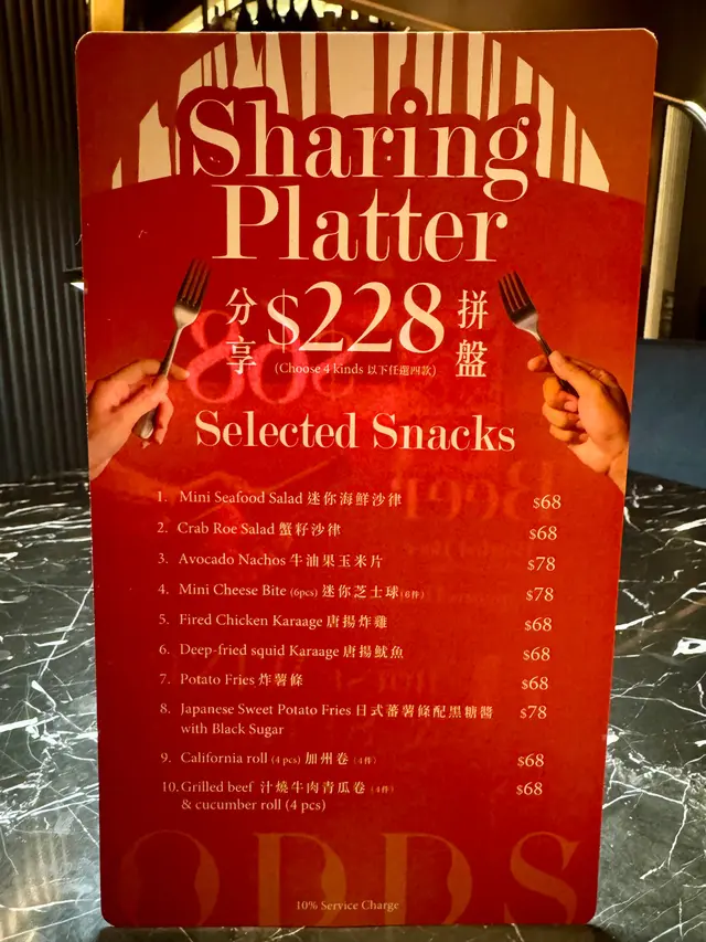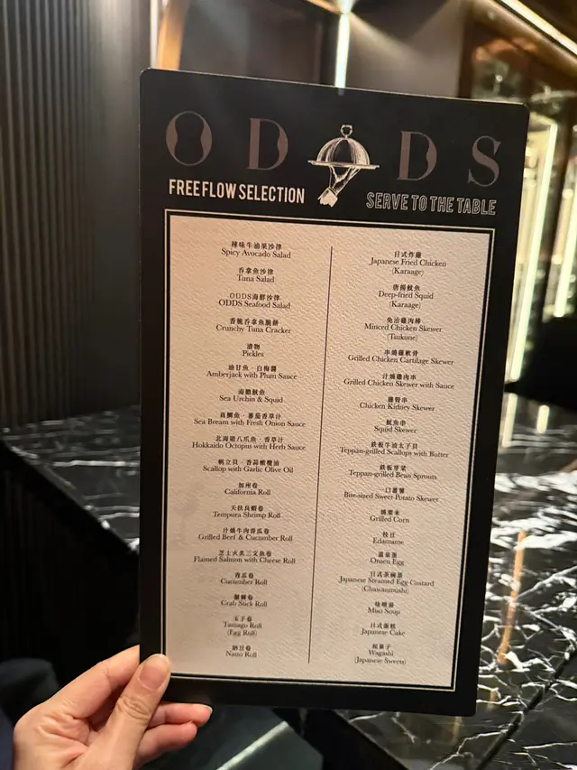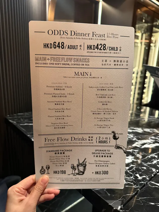 今晚我同朋友嚟到位於渣打銀行大廈地鋪嘅 ODDS 餐廳,試吓佢哋嘅晚餐套餐!只需 HKD 648,就可以享受到主菜同無限量的小食,真係好抵得來!🥳🎉一入到去就感覺到氛圍好輕鬆,設計時尚又唔失溫馨,絕對係聚餐同傾計嘅好地方🍷!無論你係想慶祝生日或者單純食飯,都係幾唔錯嘅選擇!🍽️佢哋嘅套餐都幾特別,包括主菜加無限量的小食,仲有汽水、咖啡或者茶一杯!☕️🥤 今次我同朋友選咗:- 🐟西京銀鱈魚(配白飯):鱈魚肉質滑嫩,配上香香的白飯,味道真係正!😋🍚- 🥩A4黑毛和牛牛扒:牛扒啖啖肉嫩,口感極之豐富,配上少量的調味,完全唔需要多餘嘅修飾!🔥除咗主菜份量十足之外,最吸引係佢哋有成三十幾種前菜🥗🍢、沙律、串燒、小食、卷物同甜品!📋🍰 無限量供應,簡直係食客嘅夢想!🤩 我地慢慢嚐試,真係感覺無限享受!🍻🥂想加強用餐體驗嘅話,可以選擇 Free Flow Drinks,兩個小時只需 HKD 198!🍾🥳 選擇包含:- 氣泡酒 🍾- 白酒 🍷- 紅酒 🍷- 清酒 🍶- 啤酒 🍻如果想更豪華,可以升級至豪華套餐,添加香檳(HKD 300),絕對係聚會升溫的好選擇!🥂💖呢度真係一個值得一試嘅地方!好味嘅主食再搭配無限的小食,環境靚,氣氛好,最重要係朋友之間嘅輕鬆交流,絕對令我今晚嘅體驗變得無比開心!👍✨ 下次想再嚟!🎊💫…查看更多