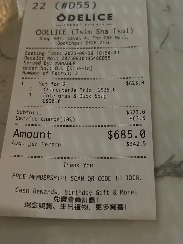 喺尖沙咀同朋友都想食Crêpe ,所以索性嚟Odelice!食埋晚飯,個晚市套餐仲包埋添!🔖Dinner Set 💲558 for two: 🍲《 蕃茄南瓜忌廉湯 》 x2 配 餐包餐包有焗熱,湯香濃唔會酸~ 我地揀咗 :🥑🦀《 Crab & Avocado Tartare 》 啖啖鮮甜蟹肉,好juicy加埋牛油果他他好fresh! 🐔《 Roast Half Yellow Chicken 》法式烤黃雞半隻燒好香,肉會偏乾,髀位會滑啲;配薯蓉同松露野菌醬汁提味~🥩《 Argentinian Angus Ribeye ➕💲50 》阿根廷安格斯肉眼牛扒做到要求嘅7成熟,唔韌有肉汁,配埋薯條同巴黎牛油汁~另外飲品有優惠🈶🥞《 Crêpe Suzette 》