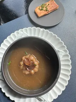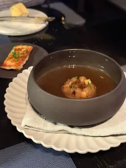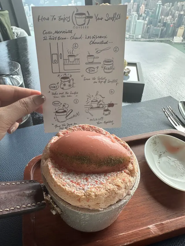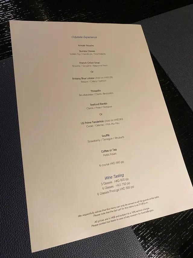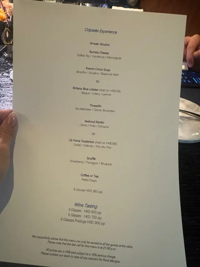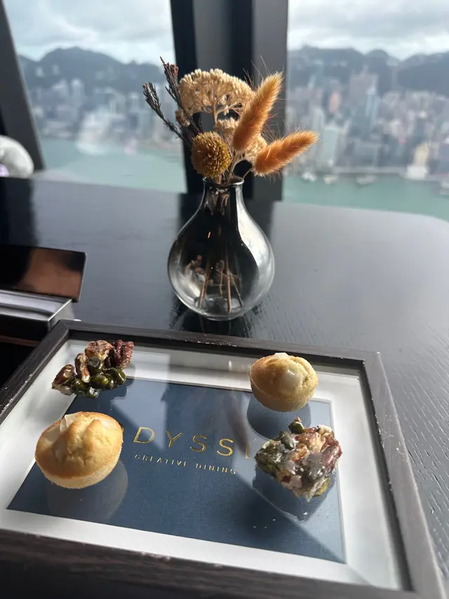 喺101樓食飯,望住香港好靚嘅夜景,一整片維港就在腳下,感覺非常寫意。今晚食飯飯嘅餐廳係odysseehk,有兩個menu,我哋揀咗六道菜的menu。好快就有Amuse Bouche,有小芝士包配自家製牛肉,另外亦有幾款麵包可以選擇。之後三件小食賣相精緻,中間牛仔形狀嘅係牛肉他他,好睇又好食!跟住就食Burrata cheese配果醬,仲有啲無花果減低油膩感,配菜仲有榛子增加口感,好味!跟住係儀式感十足嘅洋蔥湯,即場喺枱面加熱,再配上精美菂式嘅火腿芝士三文治,感覺幸福滿滿的。另一個set就要咗法國藍龍蝦,用咗慢煮炭燒嘅方式烹調,龍蝦味道鮮甜,肉質鮮嫩彈牙,墊底仲有一粒龍蝦肉意大利雲吞,成個菜式嘅口感同味道都好豐富😋下一道菜係海鮮湯煮馬友,肉質非常嫩滑,魚油香十足。另一個主菜係美國牛柳,肉味突出!另外用牛尾整嘅小包包味道都好有驚喜,配搭嘅湯汁更加係鮮味突出,好好食。海鮮意大利飯都幾好食,醬汁creamy,份量適中。最尾食埋士多啤梨疏乎厘配雪葩,飽飽的🤗…查看更多
