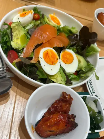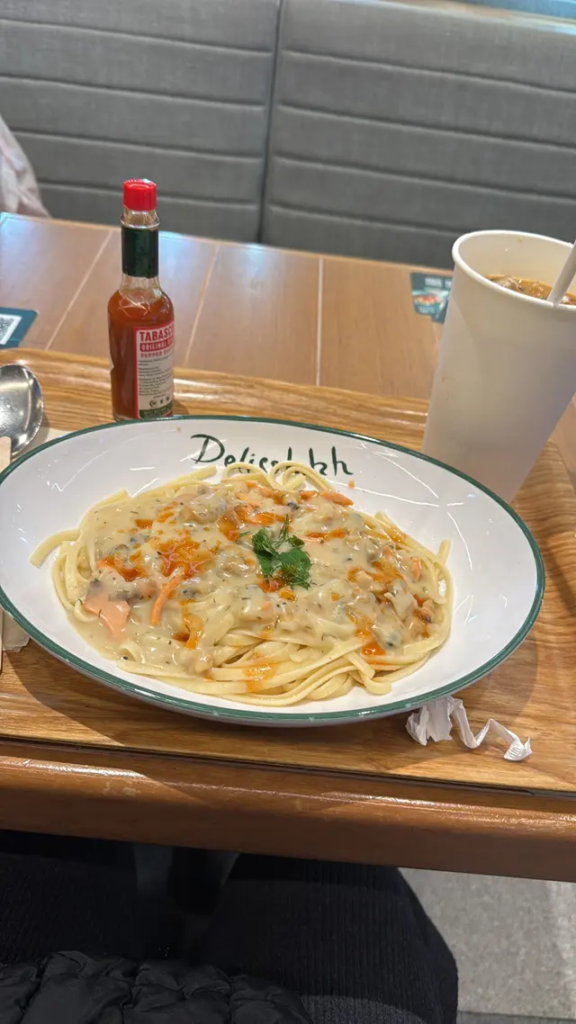 作為「Super sandwich」的忠實粉絲,這家店總有一種令人不斷回頭的魔力。在眾多菜式中,我最情有獨鍾的就是那道白汁三文魚蜆肉闊麵,每次光顧都必點!這道闊麵可說是完美演繹了「簡單中的不簡單」。濃郁的白汁creamy得來不會過膩,恰到好處地包裹著每一條富有嚼勁的闊麵。三文魚份量十足,魚肉嫩滑,搭配鮮甜飽滿的蜆肉,海洋的鮮味在口中綻放。最欣賞的是他們在醬汁中加入了適量香草提味,讓整體風味更有層次,即使吃完一整盤也不覺負擔。必配的凍即磨咖啡絕對是畫龍點睛之筆。咖啡香醇濃郁,冰涼口感正好平衡了白汁的濃厚感,兩者搭配得天衣無縫。這種簡單而滿足的組合,成了我忙碌生活中最治愈的comfort food。多年來光顧過不同分店,水準始終保持穩定,價錢合理,難怪成為不少香港人「食極都唔厭」的經典選擇。如果你也想找個地方靜靜享受一頓質素穩定的簡餐,這裡絕對不會讓你失望。…查看更多