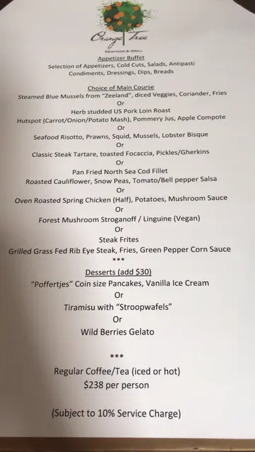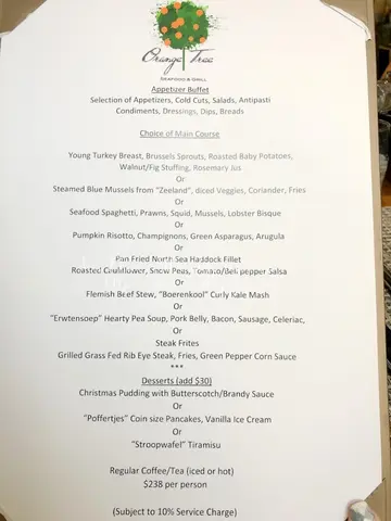 平安夜去中環搵嘢食,見到蘭桂坊有間食荷蘭菜的餐廳Orange Tree有得openrice book位,仲可以有8折,就同男朋友book咗去食!入去8:00pm食,唔係好多人,大多數係情侶或閨蜜慶祝,地方算大,係聖誕氣氛下播下聖誕歌,仲有聖誕樹,好有Christmas feel!今日食a la carte有折,所以就點咗頭盤青口,main course要招牌Wellington lamb 同海鮮意粉,甜品要Dutch Apple Pie!頭盤:白酒煮青口 Blue MusselsD mussels 雖然細細隻,但煮得好入味,新鮮,做頭盤細細碟好好食,好有胃口!Main Course: 威靈頓羊肉 Lamb fillets baked in puff pastry呢個招牌Wellington 羊肉超正,將傳統Wellington beef改成羊肉,羊肉煮得恰到好處,好lum好入味,酥皮仲好脆,又唔會包得太厚,連埋個甜甜地的汁同d茄子,成碟菜式好完滿!推介黎呢度必點!Pasta: 海鮮意粉 Seafood spaghetti跟住叫咗呢個海鮮意粉,料都好足,有青口、蝦、魷魚等,d汁有d龍蝦汁feel,不過d意粉就麻麻,可能我地嘆凍咗少少食,感覺無咁好。甜品:蘋果批 Dutch Apple Pie最後甜品點咗蘋果批,呢個係荷蘭式apple pie,有vanilla雪糕配襯,都幾好食,入面味道有d似Christmas cake嘅味道,唔鍾意呢浸味會覺得唔好食,我男朋友話有藥水味,但我覺得幾好食,有蘋果切片同提子乾等,係成餐飯好好嘅完結!食完最後大家都同門口好大棵聖誕樹影相,呢度慶祝佳節或紀念,飲下就食歐洲菜,係幾推薦大家黎食!
