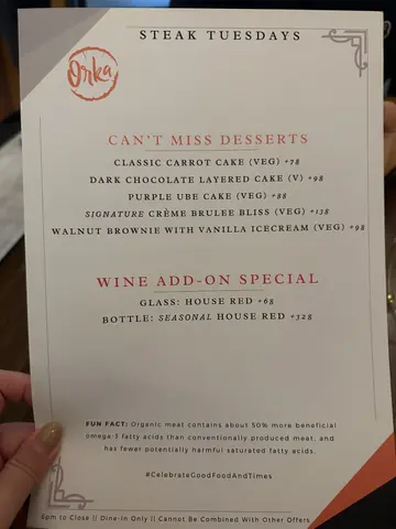Awesome Steak at ORKA Restaurant, Bar & Cafe 🥩🥗SIDES 🧆Falafel & Hummus Plate: Loved the flavours and the falafel was crispy on the outside 🥘MAINS🥩ORGANIC RIBEYE STEAK- Organic free-range Australian ribeye steak, Chef Special Diane Sauce: Had the steak as medium rare. Steak was done to perfection and was not tough at all. The sauce added wonderful flavours too🍬DESSERTS🍫DARK CHOCOLATE LAYERED CAKE - A guilt-free 70% dark chocolate vegan multi-layered cake with low Gl frosting: A very rich and tasty chocolate cake. Not too sweet 🍰PURPLE UBE CAKE - A guilt-free flavoursome purple Ube cake with fresh raspberries, yummy coconut flakes & a low-GI frosting: The ube brought the nice aroma. Very refreshing cake with the nice berry flavours 🥂DRINKS🍷House Shiraz: Great combo with the steak Food was amazing and the service was great 😋The server came to check on the food quality timely and interacted with diners well 👍🏻查看更多