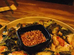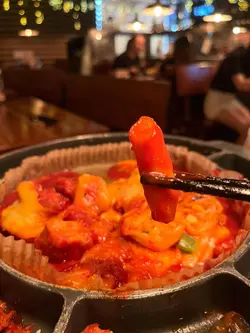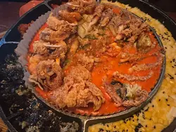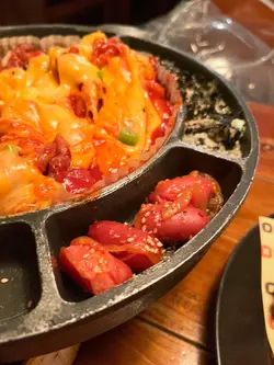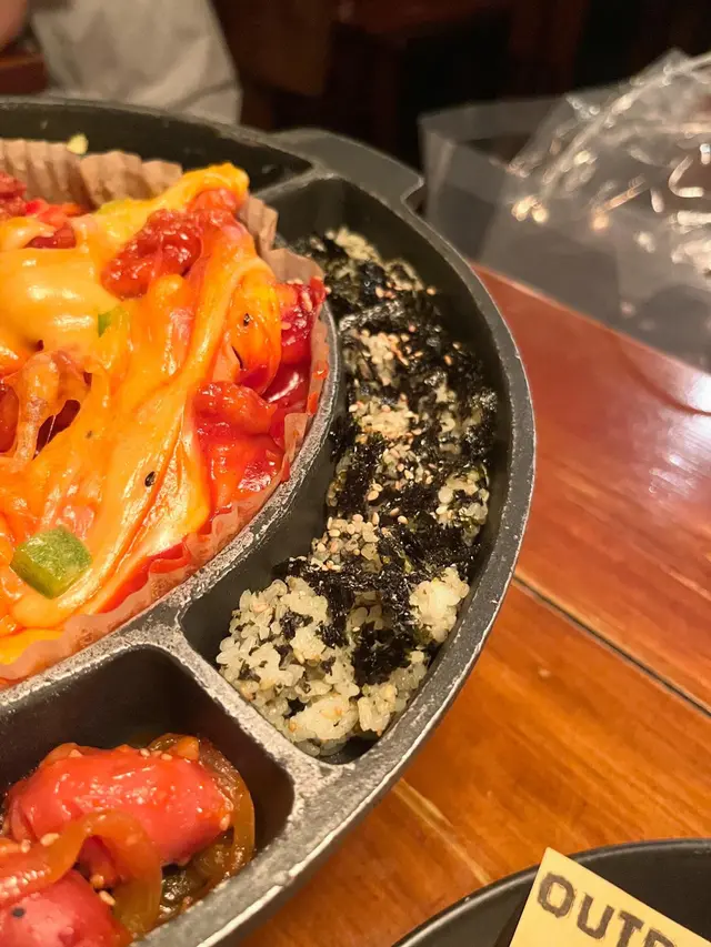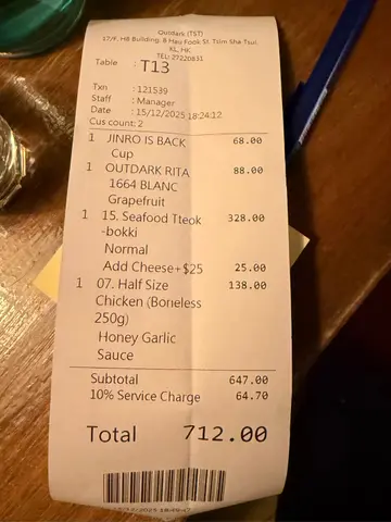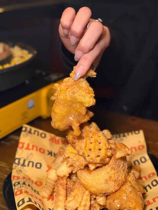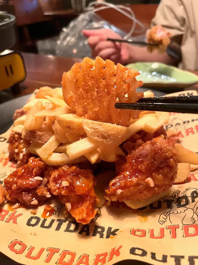 最近同朋友去咗尖沙咀嘅Outdark食韓國菜,呢間餐廳係喺H8大廈17樓,位置方便,燈光偏暗,天花布置星星燈,環境充滿情調,氣氛輕鬆。黎韓國餐廳梗係要食炸雞,Two Flavours Chicken賣相好掂,份量誇張。分別係Sweet & Spicy同Honey Garlic醬,雞件係無骨設計,食落去嫩滑Juicy,好有口感。Sweet & Spicy醬帶有啲微辣同香甜;Honey Garlic醬則甜中帶香蒜味,味道好溫和,兩款醬汁都好惹味,選擇性高。配料加咗香腸同年糕串,年糕軟糯帶Q,啱啱好中和咗醬汁嘅濃郁感,香腸則係啖啖肉,鹹香味十足。Dongrae Seafood Jijim海鮮煎餅。煎餅外皮煎至金黃帶脆,入面嘅海鮮好豐富,味道鮮甜,柔軟而且好入味,配上特製醬汁,食落去口感層次十足。韓式牛肉炒粉絲,薯粉軟糯,牛肉片份量滿足。Coolpis Peach,味道清甜鮮果香,飲落去好解渴,解散咗主菜嘅濃味,平衡得好好。…查看更多