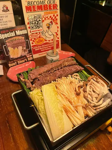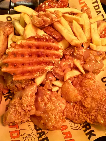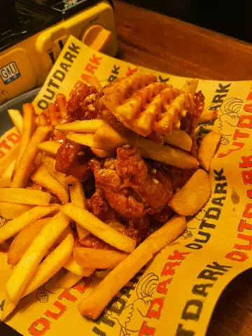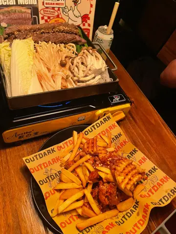同班friend去旺角Outdark食晚餐,一入門口已經好驚喜!有部免費即影即有黑白相機,我哋即刻瘋狂自拍,留念一流!餐廳環境暗暗哋,掛滿星星燈同鐵桶枱,氣氛舒服又溫馨,勁多情侶同家庭客,傾計啱晒。▪️牛油韓式烤牛肉 (Butter Flavored Beef Bulgogi):一上枱聞到牛油香到暈!牛肉醃得夠甜,用鐵板上熱辣辣,配埋金菇、韓式年糕一齊食,好惹味!聽講係正宗韓國人煮,味道果然唔同啲!▪️雙拼韓式炸雞 (原味+蜜糖蒜):炸雞即叫即炸,皮脆肉嫩仲有肉汁!原味已經好得,蜜糖蒜味香甜唔漏,份量巨大,夠3-4人分享。▪️芝士條/地瓜芝士條:拉絲拉到半米高!地瓜味香甜軟糯,好有驚喜。▪️GRAPEFRUIT (Add Soju):西柚味清新,溝埋燒酒好易入口,朋友話不知不覺飲多咗!▪️HOT PEACH LEMON TEA:蜜桃味香,飲完成個人暖笠笠,唔會太甜,唔錯。▪️芝士條好食,但食多兩條會覺得有啲滯,最好多人分享。總結:呢度食物大份又好味,環境同服務都好貼心,絕對係同閨蜜或者屋企人嚟Hea嘅好地方!會再encore!…查看更多