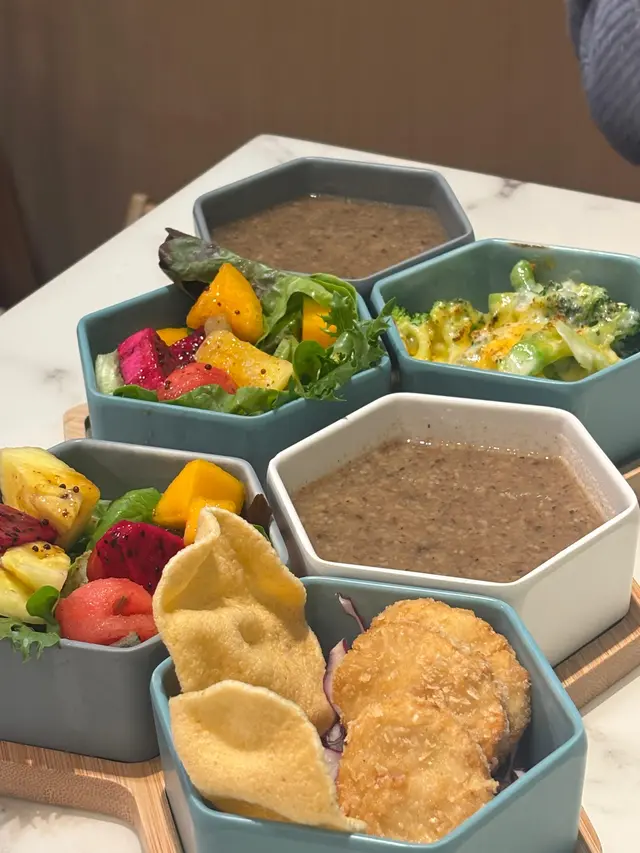 呢晚同朋友一齊嚟咗呢間喺灣仔嘅素食餐廳食晚餐🤣呢度有「伴素晚餐 DINNER SET」,係「餐湯 + 沙律 + 小食 + 主菜 + 飲品」,價錢取決於主菜,咁我哋叫咗 $198「黑松露野菌燉飯 Black Truffle Mushroom Stewed Rice」同埋 $188「竹炭 Impossible Meat 漢堡 Bamboo Charcoal Impossible Meat Burger」🤣DINNER SET 嘅「餐湯 + 沙律 + 小食」用3個六角形嘅小兜放埋一齊😁-「餐湯」係「南瓜湯」,紅紅哋色幾 creamy😁-「沙律」係好簡單嘅沙律菜加咗酸酸哋嘅沙律醋所以清新又開胃😁-「小食」揀咗「黑松露茄子」同埋「蔬菜春卷」:「茄子🍆」新鮮,似乎簡單用醬油漬過,仲有淡淡嘅黑松露香味🤣,「春卷」就脆脆哋炸得幾香口😋「黑松露野菌燉飯」大大碟,燉飯等得軟腍腍,有幾香嘅野菌味,好食🤣「竹炭 Impossible Meat 漢堡包」大大個,麵包黑鼆鼆麵包皮脆脆哋,裏邊有蕃茄生菜當然仲有主角 Impossible Meat,真係做得幾似牛肉,好食🤣晚餐飲品一杯要咗「熱玄米茶」另一杯要咗「芒果🥭奶昔 (加 $24)」:「玄米茶」大大杯熱辣辣幾香玄米味🤣,「芒果🥭奶昔」都係大大杯幾滑,唔係好甜幾香芒果味🤣$50「鮮果楊枝金露」:非常甜,典型楊枝甘露裏邊有啲芒果同埋有柚子肉🤩,真係勁甜,每一啖都感受到勁量糖分,所以食得人好開心🤣…查看更多