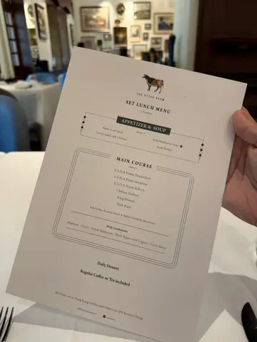 今天是朋友請的午餐,所以不知道價錢是多少到達時候,先在酒店外邊上一層,再問問酒店人士,才知道要在上一層這𥚃本身是以前的水軍總部,所以沒有太大的改動,仍保留之前的建築結構回到食物水準,看到五星級年知道十分好麵包送到枱面是微熱的,不錯看到餐牌,頭盤四味都好想吃,我們同樣選擇了阿拉斯加蟹肉沙律,侍應細心地解釋這道菜的組合和味道,非常好主菜我們揀牛扒,是肉眼扒,牛味非常濃郁,非常好吃,雖然熟了少少,但仍然好吃甜品是雪葩,可以清理一下口腔的味道早餐還包一杯奶茶咖啡