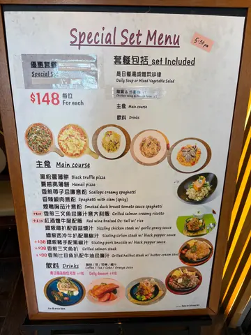 鐵板西冷牛扒配黑椒汁($138)✅賣相唔差,好少見有原塊牛油放喺面🧈✅黑椒汁俾得唔孤寒,每啖肉都有點到汁🫕👌🏻薯條,都算炸得香脆🍟👌🏻粟米有半條,味道正常🌽❌牛排幾多筋,切唔斷都咬唔爛😬❌7成熟啲肉淋異常地淋🫢📝 4/10香煎鴨胸露荀黑松露燴意大利飯 ($178)🐻❄️🔎配例湯/沙律&飲品 送是日甜品🍮✅鴨胸煎完釋放咗油香,幾香口🪿✅黑松露都幾香,每啖飯都食到黑松露味🍄👌🏻羅宋湯同餐包正常🍞👌🏻甜品係凍焦糖芝士蛋糕,焦糖厚,蛋糕係實🍰❌飲品燈汁勁酸😖❌意大利飯偏向淋身,太重忌廉,有啲漿口🤐❌鴨胸得三舊有啲少🤏🏻❌蘆筍有啲苦🤢❌食到後面好滯,有啲油膩🛢️📝 4/10~⭐️總括而言…嘢食偏貴💸,出品都係茶記質素,係港式西餐味道🍝。都明開喺尖沙咀Isquare裏面,應該大量成本都去咗鋪租到💰。值得講一下哩度啲侍應全部都媽媽級🤶🏻,好好服務態度,但人手不足,叫好耐先過黎幫你😮💨。我就無下次了🙅🏻♂️…查看更多
