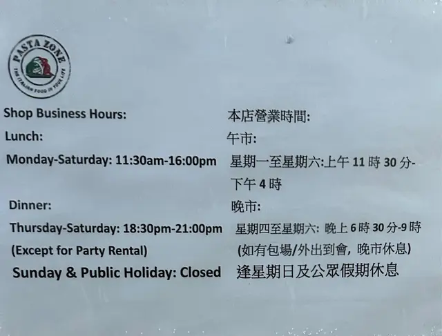 Pasta Zone (觀塘) 網址: https://s.openrice.com/QrbS0f5m800 地址: 香港觀塘開源道60號駱駝漆大廈3期1樓J室 電話: +852 23252335