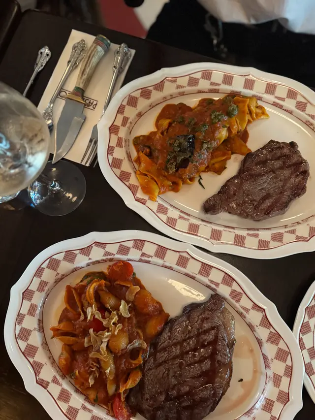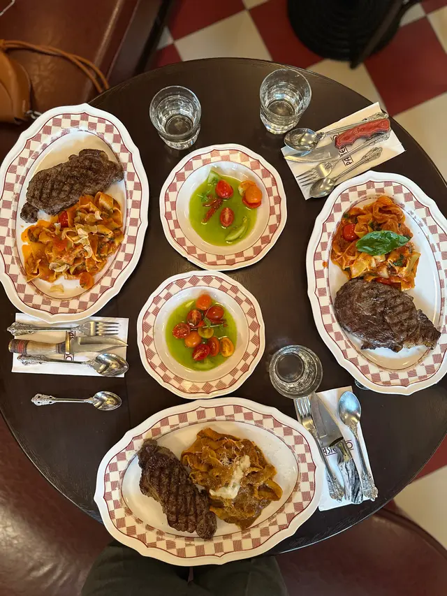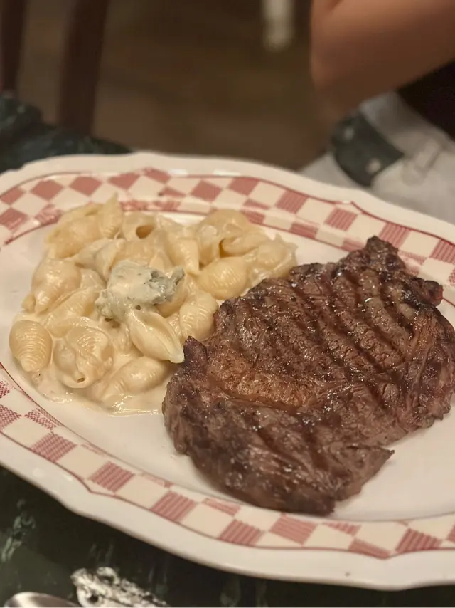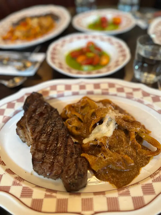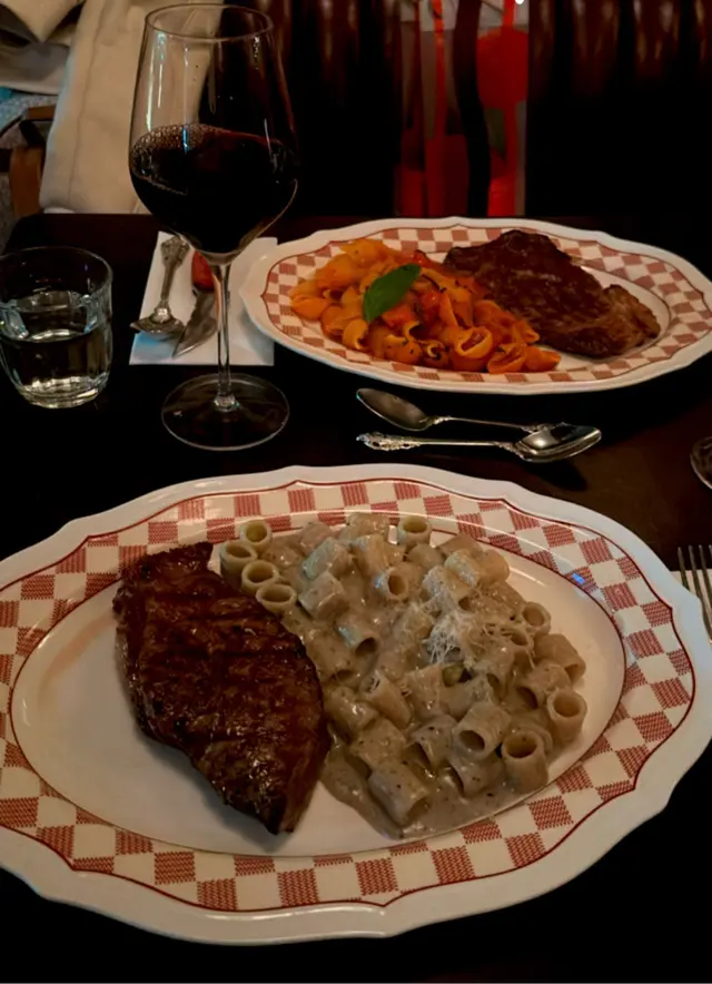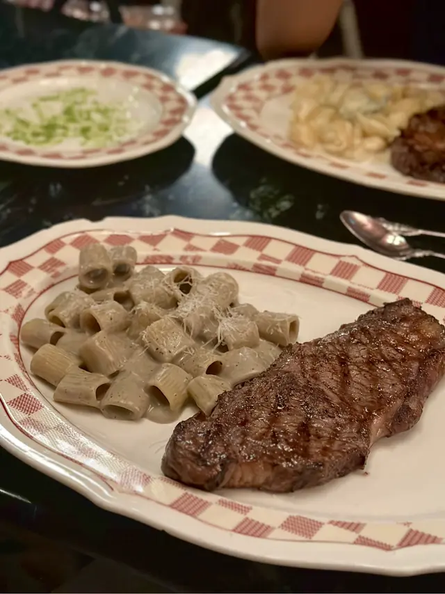 被這家隱藏於PMQ的意式扒房驚艷到!星期六中午來和朋友吃birthday lunch,全店只供應一套$388 +10% 套餐,卻完美融合手工意粉自由+乾式熟成牛扒+儀式感甜品,慶祝生日/紀念日性價比之選💫 記得提前預約⏰🔪先選牛排刀牛排刀有8款,客人要在入座前門口的展示櫃先選好牛排刀,儀式感滿滿☺️🥗沙津吃肉類和大量澱粉質前先吃點新鮮沙律菜,有助腸道消化吧🤣🍽️自選意粉形狀 5選1寬麵Pappardelle/ 義大利細麵Spaghetti/ 貝殼麵Conchiglie/ 中型通心粉Mezzi Rigatoni/ 蝸牛麵Lumache🍽️自選意粉醬汁 6選1松露醬Truffle/ 四重芝士醬Quattro Formaggi/ 羅曼斯可醬(紅椒) Romesco/ 煙花女醬(番茄、黑橄欖、鯷魚) Puttanesca/ 番茄醬 Pomodoro/ 辣味阿爾巴塔醬Spicy Arrabbiata🍝手工意粉任食上述的自選款我們揀了松露貝殼麵和四重芝士寬麵,醬汁非常香濃,意粉非常掛汁。店員還會不時捧着一大盤新鮮出爐的意粉問客人要不要加添,口味是廚師隨機烹煮的。我們也加了4次,那個青醬和不知是蕃茄還是紅椒醬也是十分惹味🤤🥩USDA Prime級熟成牛扒2選1西冷Striploin肉香濃郁帶油邊;肉眼Ribeye油花均勻,推薦5成熟😍🤎手工提拉米蘇由店員拿着一大盤分配給每個客人,然後再拿原件朱古力灑上朱古力碎,咖啡酒味平衡不死甜😊🎂生日專屬儀式感店員齊唱生日歌送上插著蠟燭的Tiramisu,這個附送的Tiramisu跟跟餐的那個有點不同,因為是冷藏過,所以香味更加明顯😋…查看更多