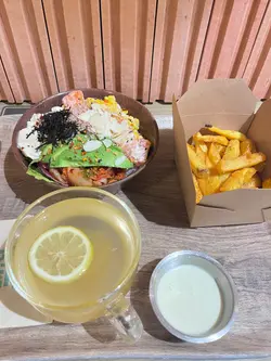 First time trying poke bowl, search some restaurants on open rice then see a lots of people recommend this restaurant even under others poke shop, so decided to try this one. The price is definitely not beautiful 🤣 but since almost everything in HK is expensive and it’s poke, so it’s acceptable price. Order poke bowl with salads and rice, plus salmon, octopus, tofu, kimchi, corn, avocado and tofu. I’m not a fan of raw food but the seafood here really makes me feel impressive , and it’s fresh cause my stomach didn’t feel anything after eating this. The fried sweet potato is kinda oily but still delicious, the hot grapefruit tea with honey is healing😇 Staff is also nice. So it’s really a nice restaurant, will definitely come back again, a very nice starting for someone who wanna try poke for the first time.…查看更多