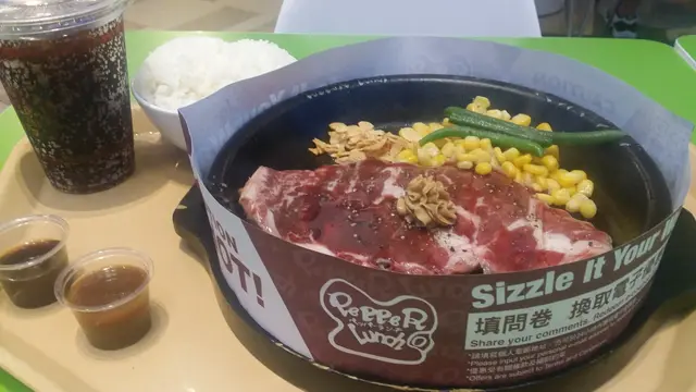 去Cyber Port商場入面既food court, 見到有連鎖鐵板牛肉飯店<Pepper Lunch>, 便入去試下。牛肉同飯既份量不少,都幾大堆頭。牛肉係薄切款,煎得幾香,牛肉不太韌,不過可能個鐵板keep住好熱,所以感覺d牛肉熟左少少,如果嫰反d會好d。另外d飯配有粟米同牛油味,仲有少少燒汁,撈埋d飯一齊食都幾香既,以$60左右的價錢來講,是可以接受的。不過飲品就冇乜選擇,如果餐廳提供多d飲品選擇,應該會更加好。…查看更多