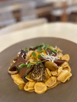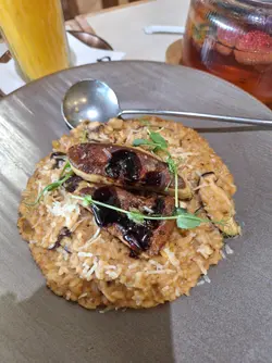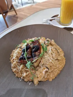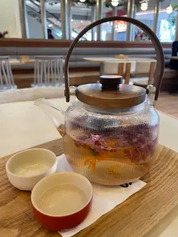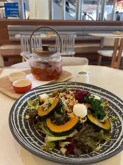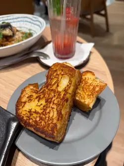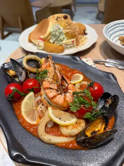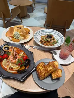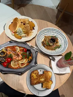 「焦糖紅寶石玉桂梳乎厘」。厚厚一塊日式舒芙蕾煎餅,表面灑滿紅寶石朱古力碎粒,淋上濃郁焦糖醬,再撒一點玉桂粉,香氣逼人。輕輕一戳,蛋香與朱古力香四溢,入口即化,甜度適中,令人一試難忘。特別推薦「楓糖烤南瓜沙律」。新鮮南瓜切塊烤至微焦,帶出天然甜味,搭配楓糖汁輕輕提味,再混入火箭菜、核桃和芝士碎,清新又帶層次感,健康與滿足感兼得。海鮮控絕對不能錯過「地中海式蕃茄海鮮配吐司」。新鮮大蝦、青口、魷魚圈與蕃茄、橄欖、香草慢燴,酸香濃郁,配上烤得酥脆的酸種吐司,一口接一口超滿足。喜歡經典意式料理的話,「意大利飯」也是亮點。米粒帶有漂亮的波浪紋,吸收了濃郁的芝士與香草精華,入口軟糯卻保留咬口,簡單卻極具水準。飲品方面,新鮮榨的橙汁清甜解膩,則是視覺與味覺的雙重享受——玫瑰、薰衣草、金盞花等乾燥花朵在透明壺中綻放,喝起來帶淡淡花香,暖心又治癒。PHI Coffee …查看更多