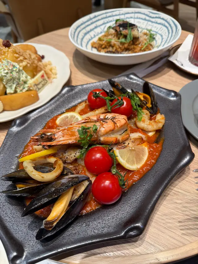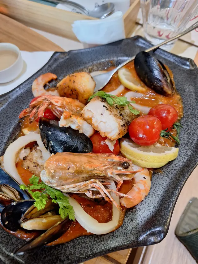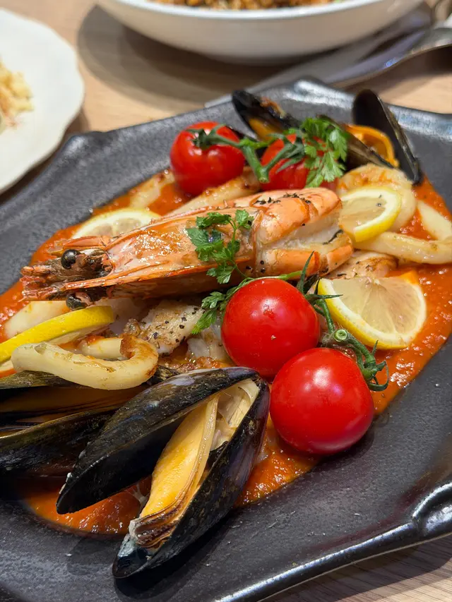 地中海蕃茄煮得好濃烈,根本每一啖都充滿蕃茄肉,配撘多款海鮮,有青口、蝦肉、虎蝦🦐、魷魚同魚柳,勁酸甜美味😋。