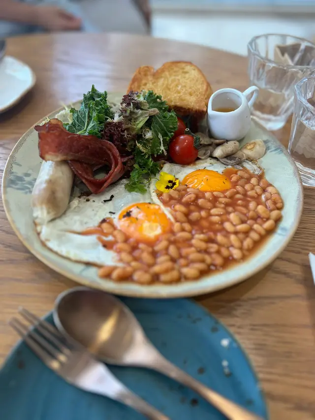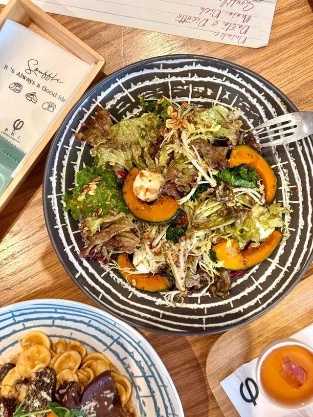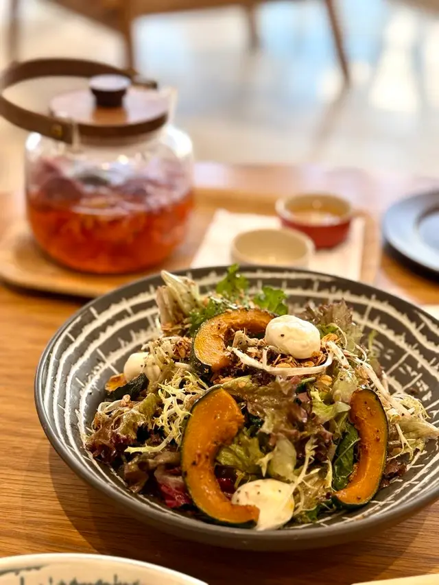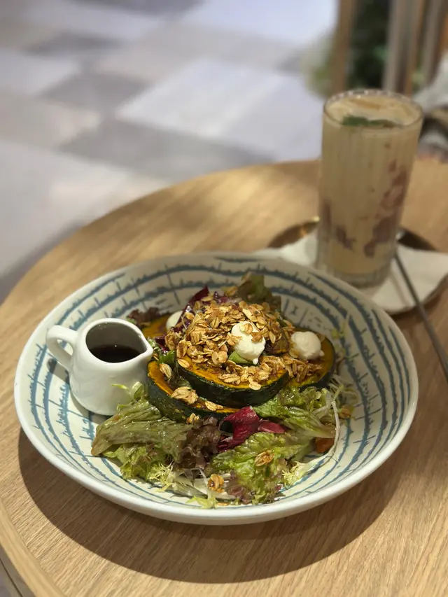 份量好大兜喎!一大堆新鮮沙律菜配上蜜糖黑醋汁,仲加入了熊妹同阿豬媽喜愛的granola 🤩!殼麥片夠纖維,仲有粒粒提子乾!烤南瓜有4大件,烤得軟熟可以連皮吃,最驚喜有burrata cheese,細細粒成粒啪好滿足😌!成個沙律的材料與調味非常夾,配撘很不錯。