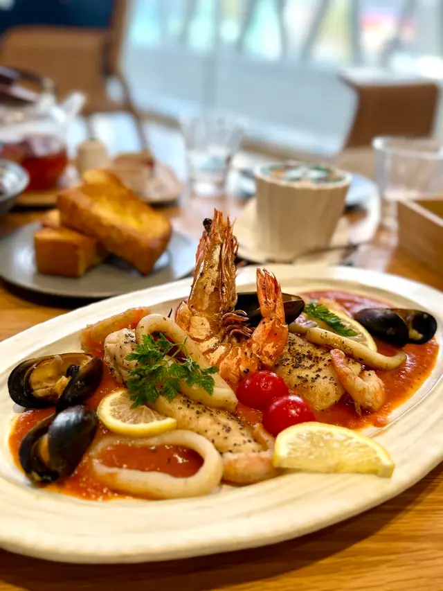 地中海式蕃茄海鮮配吐司,$218