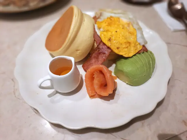 梳乎厘可以揀1、2、3件,老婆原本話食一件就夠(因為佢有麩質敏感,都喺間中偷雞食吓。),但見俾多$13就多一件,當然嗌夠兩件啦,一人一件,而基本嘅組合會包埋煙肉同煎蛋,老婆就再額外加咗牛油果同煙三文魚,整份組合就盛惠$105。啲食材質素高,牛油果夠晒熟,口感綿滑,煙肉煎得脆口,又唔肥,唔好以為煎蛋煎過籠,喺老婆唔鍾意食生蛋黃,呢隻人煎到全熟正正合佢心意;至於件梳乎厘班戟絕對保持水準,淋上糖漿,純甜美味,好有蛋香,口感綿密輕盈。