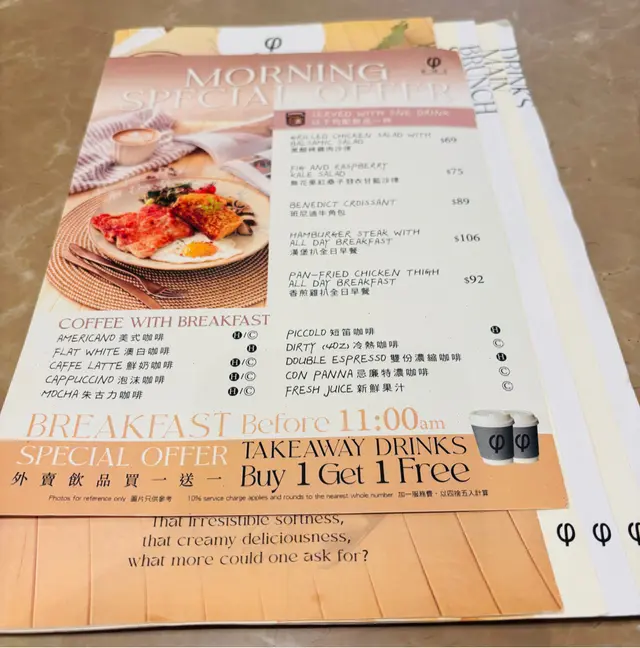 正所謂偷得浮生半日閒,平常周六、公眾假都會專登出街食早餐,但大多數一喺茶記,一喺快餐店。老婆話佢出咗少少獎金,今次就要食餐好,一於食番餐全日早餐啦(都好耐無食喇),晌美孚有供應嘅唔多,第一時間諗起「PHI」。平時就算星期六經過都見唔多人,但今次真喺有啲意外,全場近乎坐滿。一室日系淺木色裝修,配以柔和燈光,感覺蠻寫意舒服:)。我哋被安排坐晌較入位置,有種自成一角感。目測所見,好多家庭客,當然唔少喺街坊,撻住拖鞋落嚟。多年前嚟過食午餐,早餐都喺第一次,話晒比較少花成嚿水食一個影早餐。呢度嘅早餐重點,主要都喺全日早餐同梳乎厘班戟早餐,此外,都有啲意粉類、沙律類早餐。