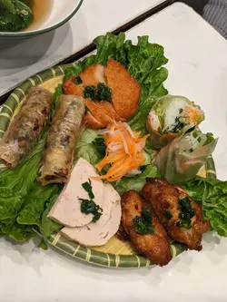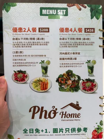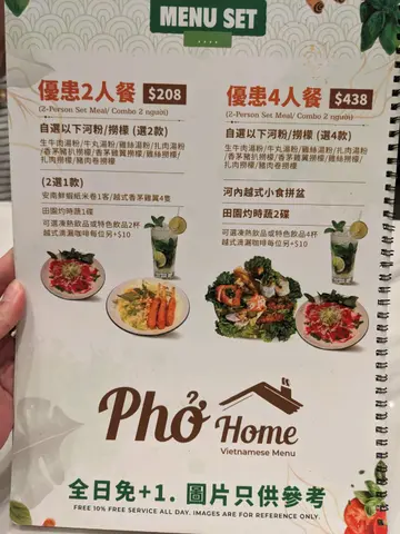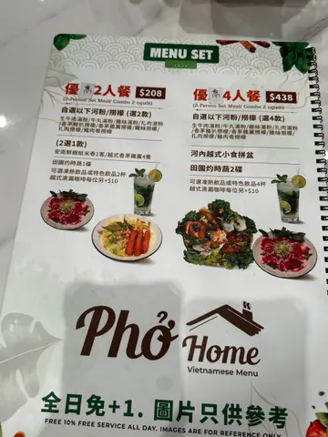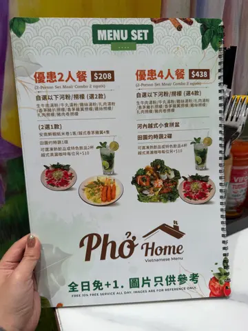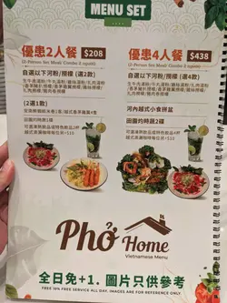 位於旺角的 PHO HOME 主打越南料理,這晚與朋友一同試了他們的 $438 四人優惠餐,這裏全日免加一的,菜式選擇多,份量充足,性價比頗高。上湯浸時蔬有兩份,我們選了生菜,四人吃份量剛好。生菜爽脆清甜,作為前菜非常開胃。小食拼盤最適合人多一起分享。米紙卷清爽,配上酸甜醬汁非常開胃;扎肉煙韌有嚼勁,香料味濃;香茅雞翼外皮脆脆的,不會炸得太乾身;蝦餅外層酥脆,內裏爽口有嚼勁;越式春卷炸得金黃酥脆,滿滿的粉絲點醬汁最好吃。主食方面可選四份,豬扒撈檬是我的至愛,豬扒煎得香,肉質不乾又爽口,撈檬汁酸甜適中,很開胃,配上花生碎更香口。牛丸湯河,清湯底清但其實味道夠濃,牛丸彈牙,河粉滑溜,是經典的越南風味。豬肉捲撈檬,朋友喜歡豬肉捲口感彈牙,也有豬肉香,其他越南餐廳比較少供應,算是特別的。生牛肉湯河,牛肉切得薄身,湯底浸熟牛肉保持鮮味,河粉吸湯味,清淡而新鮮。飲品方面,珍多冰的椰汁味香濃,綠色的珍多煙韌滑溜,很有嚼勁,當甜品都不錯。鮮芒椰汁西米露,甜度適中,芒果香甜,西米煙韌,是女生們的最愛。越南地道柑桔茶,味道酸甜清爽,無論開胃消滯都不錯。蜂蜜柚子茶,有蜂蜜清香,柚子味濃,適合喜歡果茶的朋友。總結PHO HOME 的食物味道不錯,份量足夠,全日免加一都是賣點之一,朋友聚餐或家庭聚會都適合。…查看更多