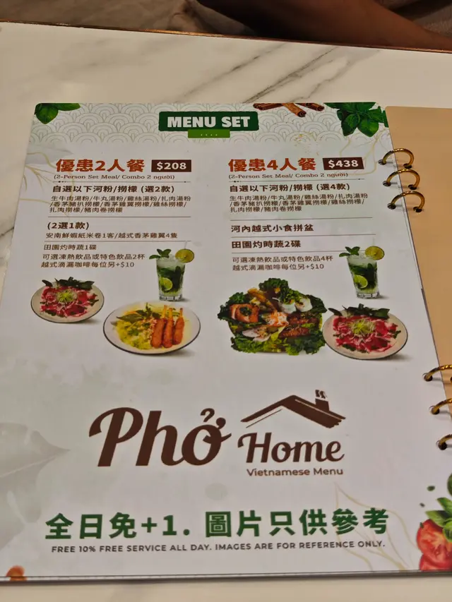 位於旺角的 PHO HOME 主打越南料理,這晚與朋友一同試了他們的 $438 四人優惠餐,這裏全日免加一的,菜式選擇多,份量充足,性價比頗高。上湯浸時蔬有兩份,我們選了生菜,四人吃份量剛好。生菜爽脆清甜,作為前菜非常開胃。小食拼盤最適合人多一起分享。米紙卷清爽,配上酸甜醬汁非常開胃;扎肉煙韌有嚼勁,香料味濃;香茅雞翼外皮脆脆的,不會炸得太乾身;蝦餅外層酥脆,內裏爽口有嚼勁;越式春卷炸得金黃酥脆,滿滿的粉絲點醬汁最好吃。主食方面可選四份,豬扒撈檬是我的至愛,豬扒煎得香,肉質不乾又爽口,撈檬汁酸甜適中,很開胃,配上花生碎更香口。牛丸湯河,清湯底清但其實味道夠濃,牛丸彈牙,河粉滑溜,是經典的越南風味。豬肉捲撈檬,朋友喜歡豬肉捲口感彈牙,也有豬肉香,其他越南餐廳比較少供應,算是特別的。生牛肉湯河,牛肉切得薄身,湯底浸熟牛肉保持鮮味,河粉吸湯味,清淡而新鮮。飲品方面,珍多冰的椰汁味香濃,綠色的珍多煙韌滑溜,很有嚼勁,當甜品都不錯。鮮芒椰汁西米露,甜度適中,芒果香甜,西米煙韌,是女生們的最愛。越南地道柑桔茶,味道酸甜清爽,無論開胃消滯都不錯。蜂蜜柚子茶,有蜂蜜清香,柚子味濃,適合喜歡果茶的朋友。總結PHO HOME 的食物味道不錯,份量足夠,全日免加一都是賣點之一,朋友聚餐或家庭聚會都適合。…查看更多