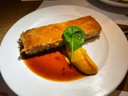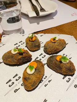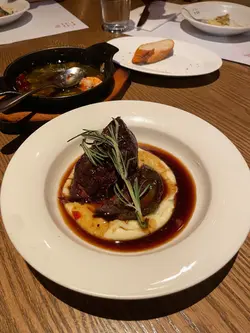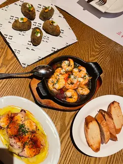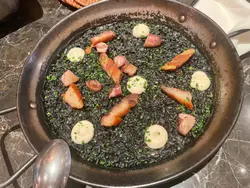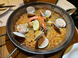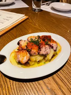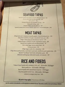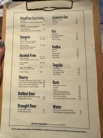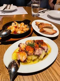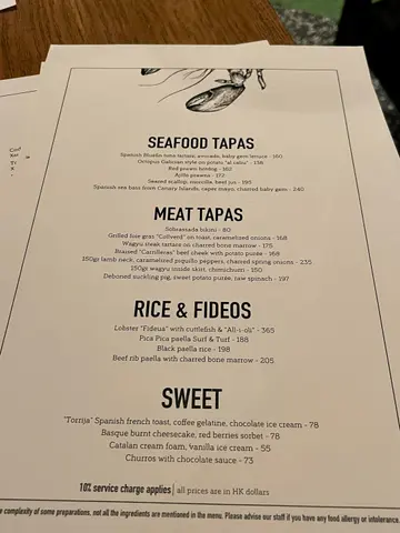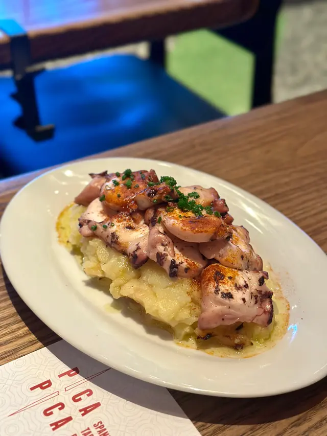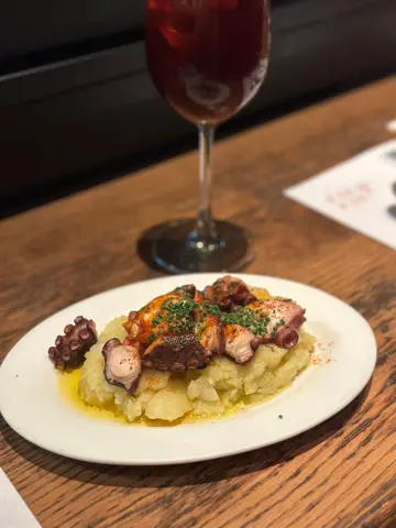 揀咗呢間幾有氣氛嘅西班牙餐廳同朋友慶祝生日。餐廳好熱鬧,有吧枱位,成個環境好啱傾計同埋放鬆。先叫一杯white sangria ($73) 同無酒精嘅virgin sangria ($68)叫咗Ibérico ham croquette同Squid & mussels croquette ($18/pc),Ibérico ham鹹香好味,而魷魚同青口味就好鮮,兩款都唔錯。Octopus Galician style on potato ($138) 真係超正——八爪魚煮到好軟淋,一啲都唔韌,同底下嘅薯蓉好夾。燒乳豬 ($197) 嘅肉好嫩滑,不過個皮如果可以再脆多少少就完美。Pica Pica paella Surf & Turf ($108) 好夠味,細份嘅分量兩個人Share啱啱好。唯一覺得有啲膩嘅係和牛他他配烤牛骨髓 ($175),味道係唔錯,但太Rich食多少少就有啲滯。最後食咗個Basque burnt cheesecake($78),個蛋糕唔錯,旁邊嘅紅莓雪葩酸酸哋可以解膩。最值得讚嘅係佢哋嘅service真係好貼心。唔單止幫我哋喺碟上面寫字,仲準備咗張全體員工簽名嘅生日卡同print返張相比我哋