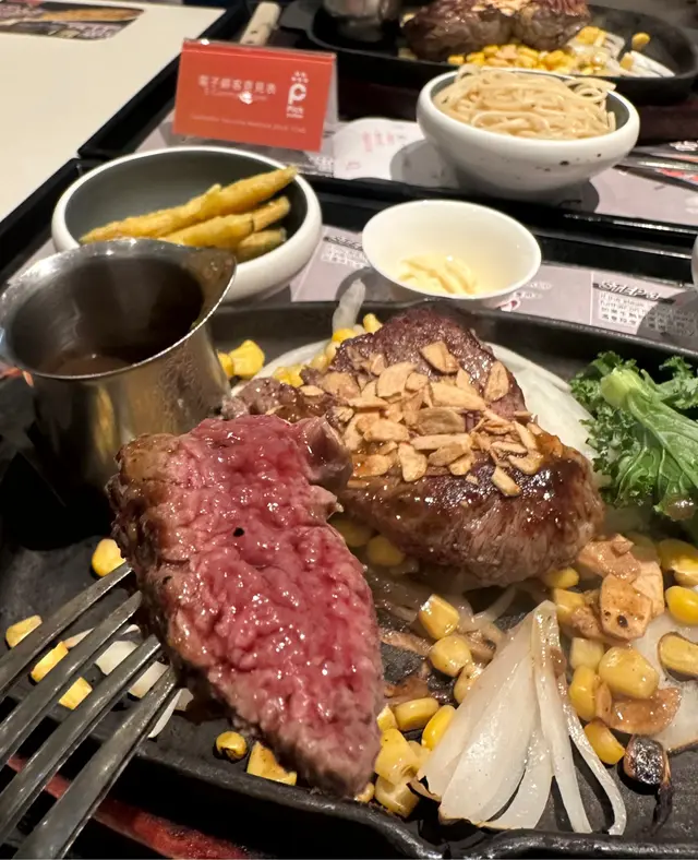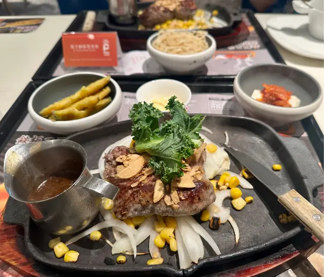 牛柳配炸南瓜片&泡菜豆腐+熱啡