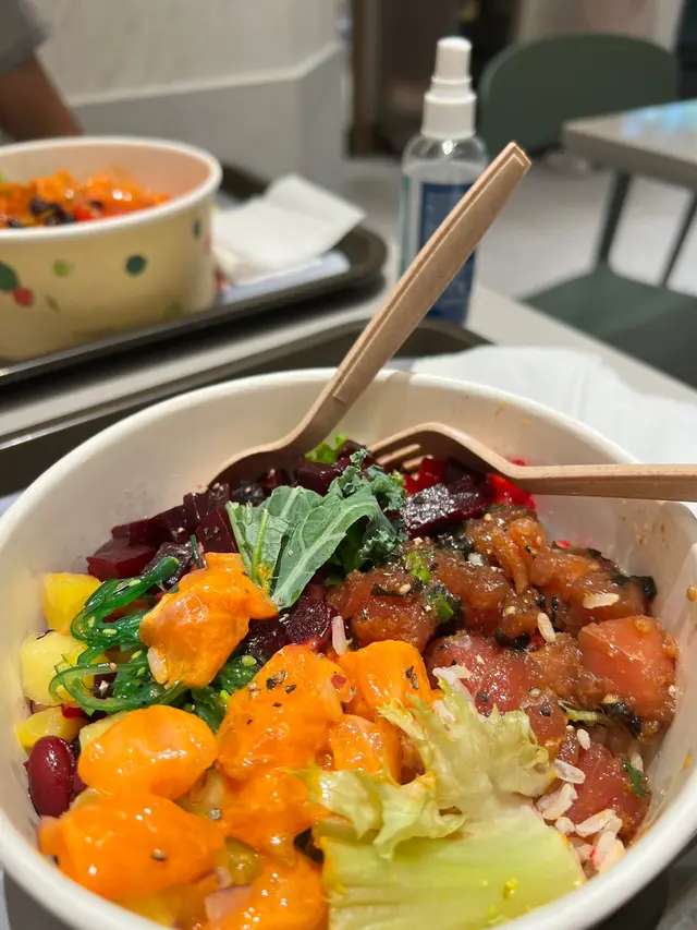 最近減肥,介精緻糖澱粉質,好小地方有得食黄姜椰菜花!我叫左個Lazy Ginger(姜汁松板豬,黄姜椰菜花同和風組合-烤南瓜,玉子燒,炸豆腐,四季豆、毛豆、配自家製醬油) oh!攪拌好之後好好食!一開始怕食完會唔夠飽,始終無飯,點知食完完全唔會😂椰菜花飯真係好好飯。友人叫左Spicy Couple(煙燻辣味雙拼(三文魚加吞拿魚,沾烏冬,泡菜組合-泡菜,青瓜,蒟蒻配韓式辣醬)友人話辣辣地好好食,同個烏冬同韓式辣醬好夾。另外朋友叫左比較細食,所以叫左Kid's Poke(慢煮雞胸,菠蘿,黄姜椰菜花同彩虹組合-蕃茄,青瓜,甜椒配自家製醬油) 雖然個碗細左,但友人都覺得勁飽😂菠蘿同埋甜椒既組合好夾,酸酸甜甜好開胃,仲有小小紫菜絲係上面,撈勻嚟食真係唔錯。總結:平均$80有一個好健康又飽肚又有營養嘅晚餐,味道仲要唔差,性價比唔錯。我會繼續食呢間餐廳。❤️查看更多