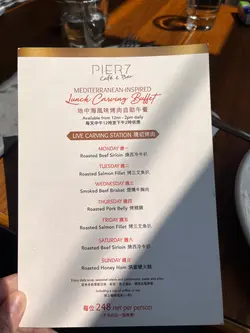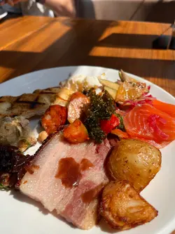 全間餐廳俾我個感覺好得意,望唔到景色,最特別係主菜唔係分開上都係自助餐出去夾🤣一睇就覺得好有異國feel,但整體感覺有啲亂晒。烤鮭魚真係盤入面嘅highlight,皮脆但係食一兩嚿已經飽,入面仲嫩滑得嚟,仲有啲香料(可能係孜然或者胡椒)加進去,味道超正,超有中東風味。旁邊嗰啲香腸都幾正,熟得啱啱好,皮脆肉嫩,仲有一啲煙燻味,食落好有滿足感。馬鈴薯泥就差啲火候,質地軟滑OK,但調味好單調,少咗啲常見嘅奶油或者草本香(比如迷迭香或者百里香),食落有啲淡。配菜有烤紅椒同茄子,顏色好靚,好似地中海菜嘅風格,但口感有啲軟,似過熟咁,調味又偏油,可能用咗太多橄欖油或者奶油,冇保留到蔬菜嘅清甜同脆感,同土耳其菜輕盈嘅烤菜style有啲唔搭。總體嚟講,餐點食材選擇多姿多采,但攪亂咗一齊,風味之間無咩統一感。建議少啲食材,例如留低鮭魚同香腸做主打,加啲烤蔬菜,再拎啲土耳其特色調味料(比如sumac或者za’atar)提升下格調。仲要少啲油,留住蔬菜嘅鮮脆口感。呢餐適合鍾意大份量混搭嘅食家,但細節上仲有改善空間,下次試試應該會更好!…查看更多