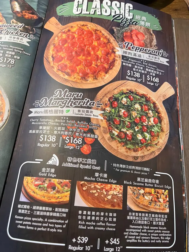 🍕Pepperoni - regular 10” $138呢個pizza必叫!pizza嘅配料有辣肉腸、紫洋蔥、馬蘇里拉芝士、意大利香芹,一定要趁熱食,啖啖肉之餘,個皮係脆嘅,好食😋🍛鮑魚肝醬海螺意大利飯 $188呢個意大利飯綠綠地,主要因為佢有海螺、鮑魚肝醬同埋紫菜,食落去啖啖都有鮮味。另外仲有洋蔥、杏鮑菇、意大利香芹同埋青蔥,口感豐富,唔錯👍🏻而且佢個飯好creamy,軟硬適中。🍕韓國烤肉芝加哥 $223呢個Pizza相比起pepperoni就冇咁出色,不過鍾意芝士嘅你應該會勁鍾意食,因為佢嘅邊係芝心邊🧀配料有雙倍馬蘇里拉芝士、芝士條、牛小排、辣肉腸、蕃茄、巴馬臣芝士、糖霜、意大利香芹、MARU蕃茄醬,食到最後會好膩😣🍝至尊熱狗意粉 $173勁打卡able,呢個意粉係蕃茄味,有少少辣,但整體唔錯😋配料有法蘭克福腸、辣肉腸、車厘茄、黑橄欖、巴西草、蘑菇同埋新鮮馬蘇里拉芝士。意粉係扁意粉,勁掛汁,夾埋啲配料一齊食好正🤩🍗蜂蜜蒜泥炸雞 (六件) $123個炸雞好脆,唔會話好厚粉。蜂蜜味都夠,我中意食成隻炸雞都係汁,啖啖都食到甜甜地,好正😋…查看更多