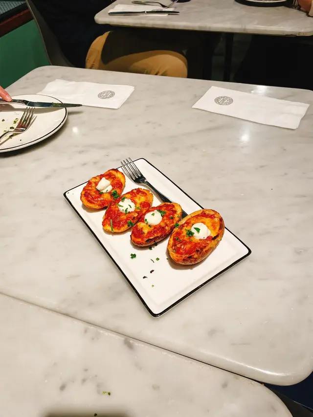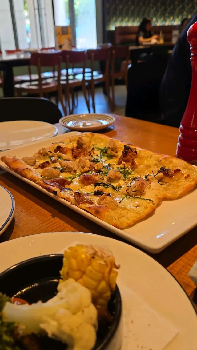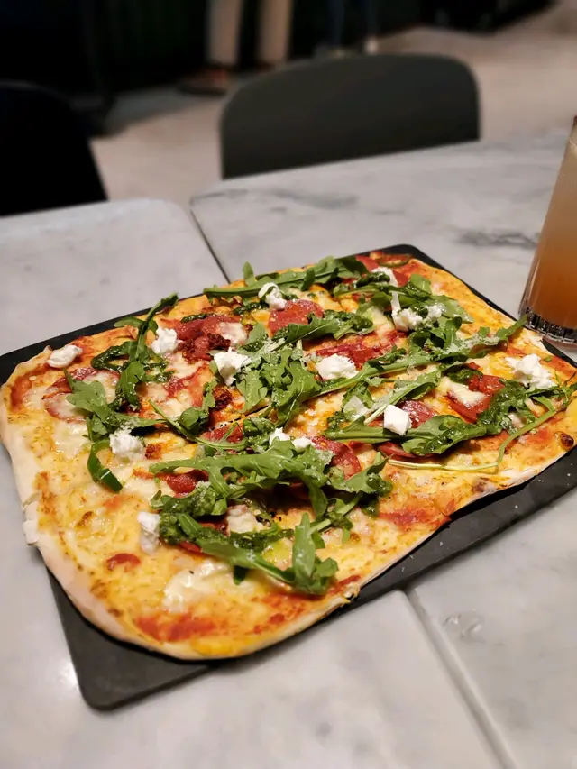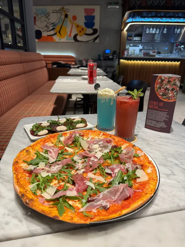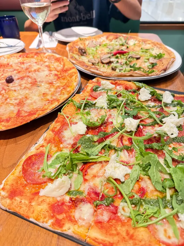 Weekend晚市入坐時唔洗等位,食到一半full晒。一行4人叫左個4人餐😗有2款前菜,4款main(可以揀pasta同pizza),4杯餐飲,可以加錢叫酒👍🏼前菜: 沙律正正常常,係健康嘅味道😂焗麵包球二重奏Baked dough balls一口一粒好煙韌,本身冇咩調味,一款有芝士餡,配有3款醬點,好食💪🏽主菜:3款pizza同肉醬意粉重點介紹北京填鴨pizza,超好食好特別。第一次見依隻味嘅fusion pizza😀薄餅底放上鴨肉甜醬同蔥,真係食片皮鴨咁(⁎⁍̴̛ᴗ⁍̴̛⁎)超好食👍🏼👍🏼👍🏼👍🏼長方形卡拉布雷斯薄餅,面頭有蕃茄醬 辣肉腸 羅勒醬 芝士 辣椒同火箭菜🫢好食的,我唔食得辣覺得好辣😂芝士好多好拉絲(/ω\)查看更多