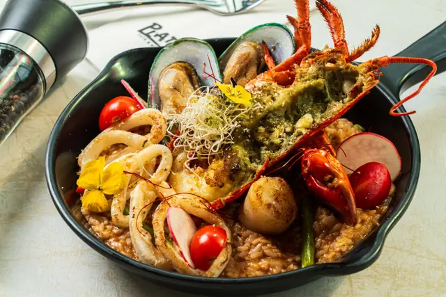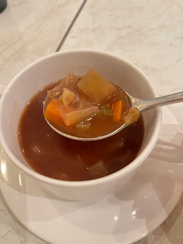脆炸蕃薯條濃濃既蕃薯味飄左出黎,薯身偏腍身易入口,熱辣辣上枱更具吸引力精選二人套餐餐湯係甘荀湯個甘荀Bled到好蓉,飲得出每啖都係甘荀肉,勁岩我呢啲扮健康既人士田園沙律佢係用左柚子醋作base,我係鍾意呢個味多過黑白醋,感覺更Fresh同開胃,細細杯既沙律足夠作為前菜之用蒜片白酒煮蜆三色椒+菇+酒+重蒜同露筍做醬汁拌蜆,隻蜆仲要幾大隻下又鮮甜,填滿哂白酒既味道,係好想食多幾隻囉波士頓龍蝦龍蝦汁意大利飯擺盤漂亮,龍蝦肉質彈牙,Risotto飯底份量足,粒粒粒分明,汁底菜配有蕃茄露荀,諗住幫女友獻恩勤摵殼既我點知一起就出左黎個龍蝦肉,easy剝呀!炭燒澳洲肉眼牛扒嗌左五成熟既肉眼扒,易切同時入口一咬即開,冇韌身既感覺,伴碟配上焗薯蛋黃醬,飽肚幸福感黎哂