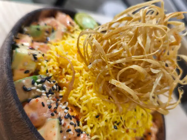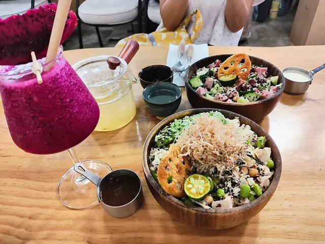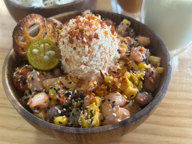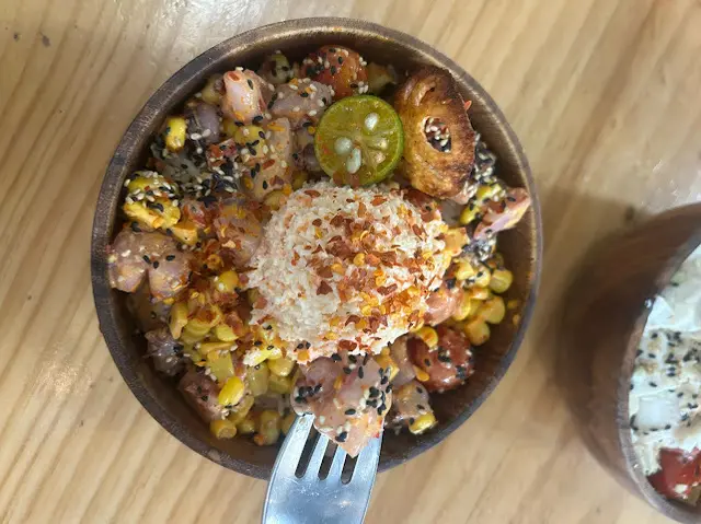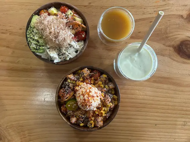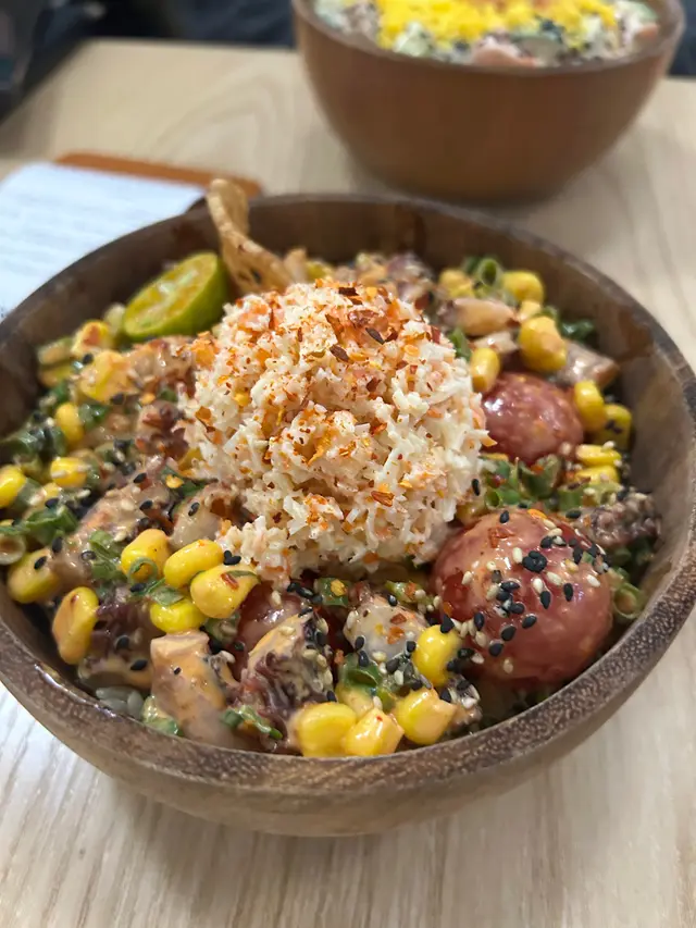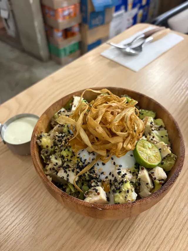 位於深水埗夏威夷小店第一次食這種碗飯叫左兩種飯MAHALO & KORNERMAHALO 裏面有煙燻鴨胸,溫室青瓜,紅腰豆,鷹嘴豆,三色藜麥,芝麻,果仁。。煙燻鴨胸切成一粒粒,帶點咸香,很容易入口,配青瓜,帶點清新。KORNER 慢煮雞胸肉,三色藜麥,牛油果,溫泉蛋,芝麻,炸牛蒡。。佢所有食材都係粒狀配搭,很方便減肥叫這種係一個不錯選擇,可以食得健康一啲。Cocktail Shrimp (non-alcohol)呢個小食好吸引,炸蝦🍤 配有4個醬料,味道由淡至濃味到辣味,好特別,外面好脆,入面係蝦,點埋醬,好好食,完全提升咗,必點。Red dragon fruit juice叫左杯 紅火龍果汁 老闆話塊火龍果片係佢哋自己風乾清新火龍果味 不會太甜Avocado smoothie另外老公叫左杯牛油果奶昔滿滿牛油果 配奶昔 簡直係絕配肥嘟嘟恩物 嘻嘻 服務不錯,值得支持的小店還有佢選擇雖然不多,不過可以配搭選擇自己喜歡的口味,不錯。兩人價錢如下,希望香港餐飲可以越來越好。…查看更多