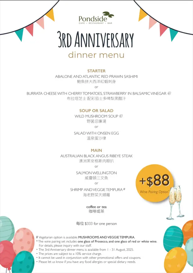 已經不止一次到訪過香港公園內的西餐廳吃午餐和晚餐,每次用餐的感覺都很好,所以已經數次跟男朋友或其他朋友來吃午餐和晚餐了;最近這間餐廳迎來開業3周年的重要時刻!聽說店家為了這個日子推出多項優惠啊,其中一個就是用三百多塊錢就吃到3道菜的晚市套餐啦3rd Anniversary Dinner Set $333/ppWine Pairing +$88Starter(2選1)鮑魚拼大西洋紅蝦刺身/布拉塔芝士配彩茄士多啤梨黑醋汁Soup or Salad野菌忌廉湯/ 溫泉蛋沙律Main(3選1)澳洲黑安格斯肉眼扒/ 威靈頓三文魚/ 海老野菜天婦羅Coffee or Tea3rd Anniversary Limited Edition - 黑朱古力布朗尼蛋糕配雲呢拿雪糕 $68店家這次推出的3周年晚市套餐是全新的搭配來啊!三道菜已經包括前菜、餐湯/沙律及主菜,多加$68就可以品嚐到這裡的自家製3周年慶的限定甜點;愛喝酒的朋友就可以另加$88有wine pairing,加上本來店家的食身質素就很高,怎樣看也是非常超值的選擇吧!每次到訪自己都很喜歡吃這裡的餐前麵包,晚飯時間更會有3種選擇且全由店家主理製作,無論是加入果乾或果仁的小餐包或是芝士條的味道都不錯,搭配自行調製的香草牛油就更惹味了!二人同行的話很推薦每款餐點都來試一同分享會更好啊~ 前菜有鮑魚拼大西洋红蝦刺身跟布拉塔芝士配彩茄士多啤梨黑醋汁,先吃後者有原個從意大利入口的布拉塔芝士,芝士口感柔軟絲滑,帶有豐富的乳脂香;配上沙律菜、兩款彩色車厘茄及士多啤梨,再淋上黑醋汁令味道變得豐富多了!再吃鮑魚拼大西洋红蝦刺身,將食物放到酒杯中非常精緻,鮑魚以磯燒方式處理再切成丁粒容易入口,鮑魚自身的味道加上調味就已經夠新鮮,可再蘸一下帶有芥末的特調燒汁,鮮味會進一步提高啊!至於大西洋紅蝦刺身同樣出色,蝦膏香濃甘甜,蝦肉爽甜鮮美~至於餐湯跟沙律方面,自己跟朋友都很喜歡野菌忌廉湯,店家的野菌忌廉湯非常濃郁而且沒半點夥粒感,忌廉打成泡沫狀所以口感更為柔滑,更要一讚廚師的細心,因載湯的餐碟有加熱且直到喝完湯為止碟身還是暖啊!另一款溫泉蛋沙律可以說是賣相最漂亮的一道菜啦!先將青瓜片鋪成花邊狀放碟底,然後依次放上白麵包、蕃茄跟溫泉蛋,旁邊就放滿食用花、蟹籽和少許醬汁,可見廚師的心思啊,真的很漂亮很好打卡!朋友說這個看成生日蛋糕也沒問題呀~ 口感來說絕對是豐富的(看食材就明白),味道上這個就會偏清淡一點,不過配上蟹籽和醬汁之後就不成問題了主菜方面就有兩款西式跟一款日式可選,以往到訪這店都以西餐為主,看到日式的主食還是首次;問過經理才知道餐廳聘請了一位相當有經驗的日廚到任!如果想試試日式主食可以選啊(後記:到訪後數天再次來到餐廳,嚐過大廚製作的天婦羅實在大讚好吃!天婦羅炸漿夠薄食材也是高質量和鮮美的)這次還是吃西式主食,5分熟的澳洲產的黑安格斯肉眼扒燒得非常香口,份量十足,切開仍是粉嫩但沒有多餘血水,牛味濃郁,軟嫩腍滑又多肉汁,且帶有豐富的油花香氣,配經典的燒汁絕對令一眾嗜牛人士滿意!另一款就是不常吃到的威靈頓三文魚啦~ 自己也是第一次吃啊!三文魚以酥皮包裹著烤得金黃酥脆,酥皮經過烘烤後呈現出金黃酥脆的外觀;中間還有一層菠菜芝士醬包裹在三文魚和酥皮之間,與三文魚的味道沒半點違和感,也提升了整體風味!而三文魚魚肉的肉質仍保持嫩滑,入口即化,三種口感實在豐富~ 再搭配忌廉醬汁味道又會截然不同啊!而配菜方面都同樣出色,煎過的車厘茄、露筍都很鮮美爽脆,薯蓉充滿奶香又滑溜~ 自己很喜歡這道菜,配醬汁吃真的很好!甜品方面廚師為了這次 3周年慶的限定甜點就由廚師準備了黑朱古力布朗尼蛋糕配雲呢拿雪糕,黑朱古力味道非常濃郁而不苦澀,不會太甜太膩而且還會嚐到粒粒朱古力碎,而且烤得較鬆軟吃起來很濕潤不會太乾啊~ 飲品方面都是以咖啡或茶為主,會喝酒的朋友就建議加錢來個wine pairing吧!經理會先為客人送上welcome wine,再按主食選擇配對合適的紅酒或白酒,令整個用餐體驗更為完美啊除了這個3周年晚市套餐外其實還有超人氣的afternoon tea set及weekend semi-lunch buffet的優惠,而且每位客人均會收到由店家自行設計的環保袋,價錢相當超值啊!來用過餐的朋友就知道店家的afternoon tea set一直很受歡迎,而周末的semi-lunch buffet會有晚餐出現過的主菜外更會供應其他小食如cold-cut等;不過供應期就只有一個月直至8月31日,想食的話就要好好把握時間訂座了…查看更多