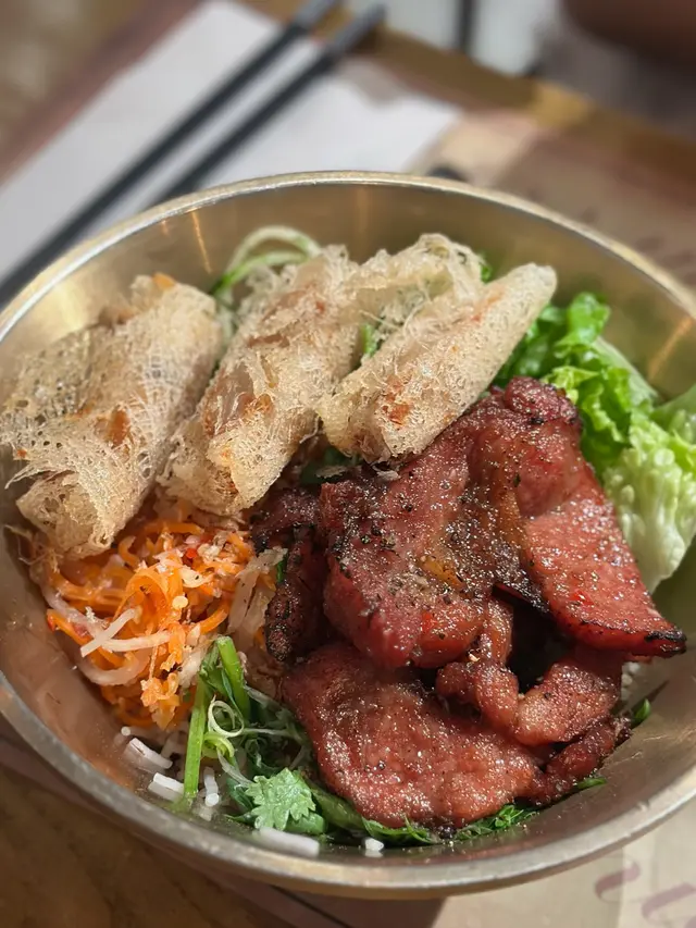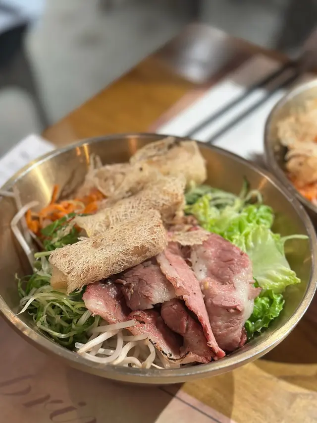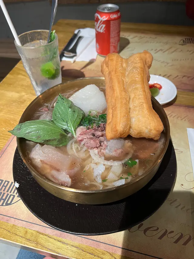 在中環偶然遇到這間店 位置在嘉咸街街市附近 入口有點隱蔽的My Central樓下電梯到1樓 ·🐂牛孖寶湯河(生牛肉+牛筋)招牌生牛肉拼上牛筋 份量都幾多 生牛肉牛味都幾濃郁 牛筋口感嫩滑 骨膠原滿滿🥹湯頭清甜 河粉軟滑有嚼勁·套餐+$ 可配小食 揀咗個米紙捲越南米紙 包著大蝦🍤 胡蘿蔔🥕青瓜絲🥒、米粉等 配上濃郁的花生蘸醬 內餡很足口感非常豐富😋·🥠炸賓墟店員推薦要食的一道菜 很陌生的名字 所以就試試🤭底層脆口的蝦片 上面有炸賓墟、蔥油、越式沙爹醬、櫻花蝦、豬肉鬆 口感豐富惹味 ·🌯越式蝦餅法包這個法包真的不簡單 除了主配料外 配菜還有自家漬蘿蔔酸菜、生菜、青瓜、沙律醬、自家制雞肝醬、芫荽、蔥、金不換等 主配料選了香脆的越式蝦餅 都唔錯!·🍋‍🟩青檸梳打非常清爽可口的飲料 夏日必備👍🏻·🍹特式檸檬茶夏日必喝的檸檬飲料 店家嚴選的茶底 配上鮮檸檬汁 查看更多