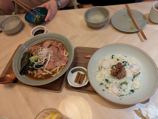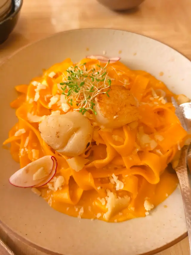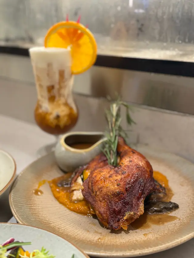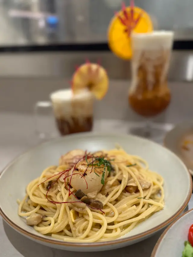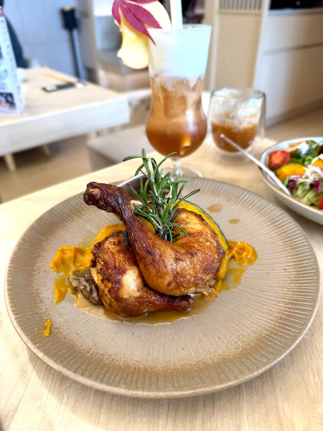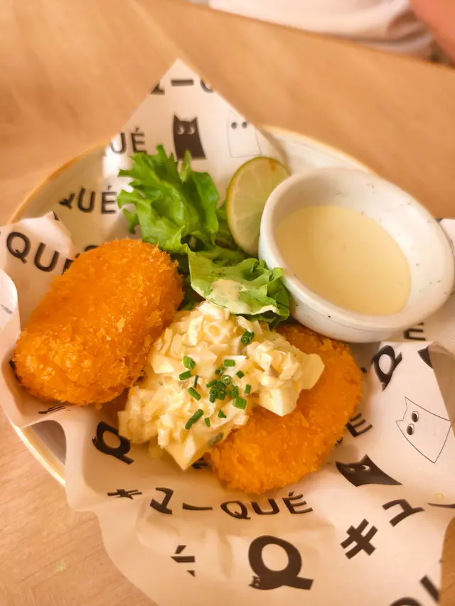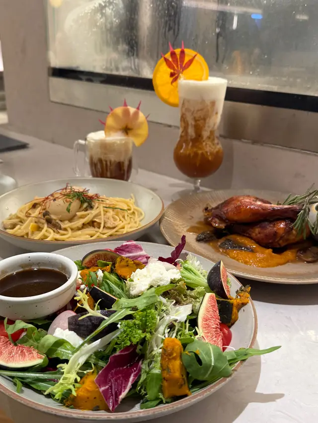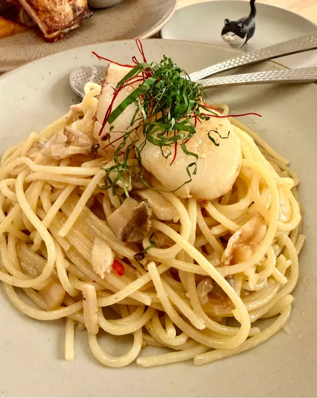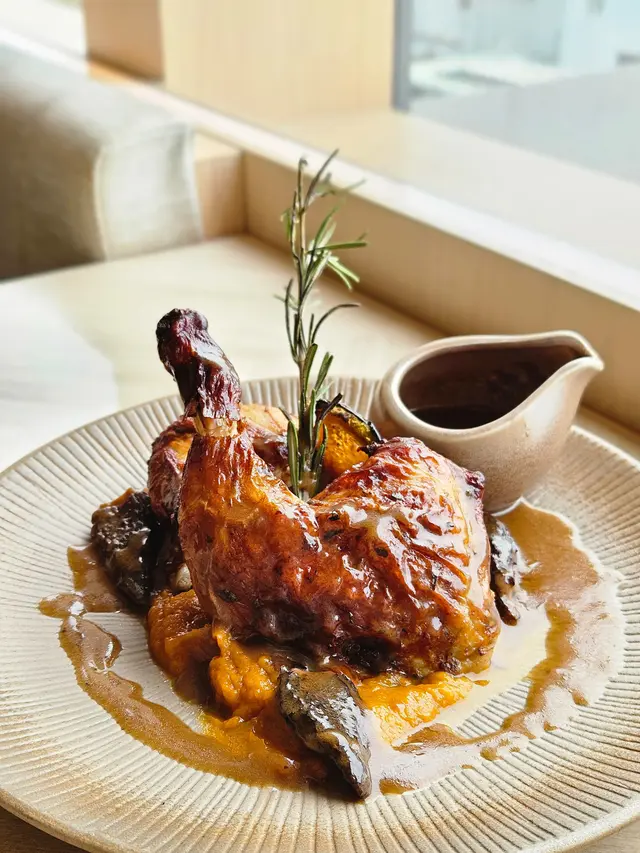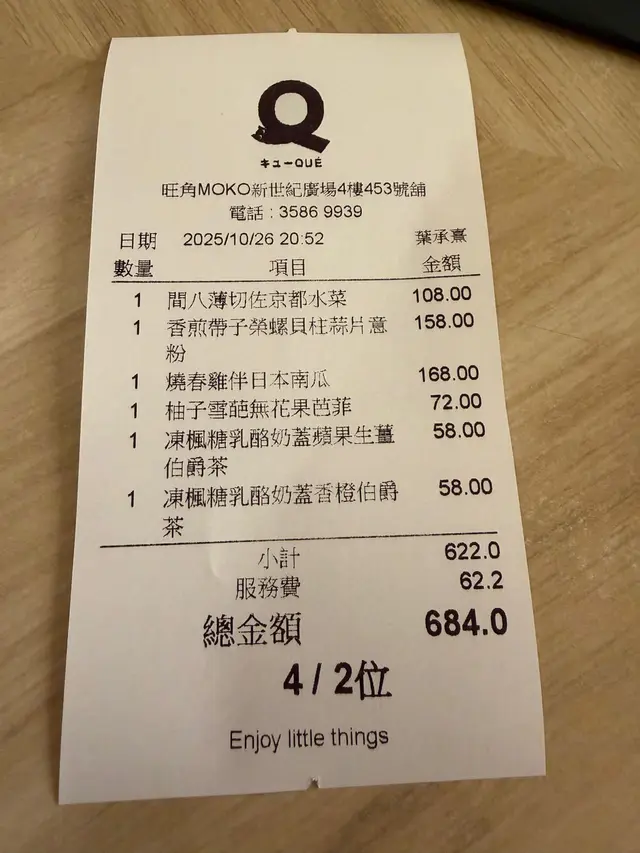 QUE,旺角MOKO分店,木系風精緻裝修,又靚又舒服😌入到黎已經有好Chill既感覺,主打和洋美食,即係日式西餐👍🏻Menu全部都好打卡able✨仲有貓貓做主題😽秋冬旬味,最新餐牌好吸睛即刻試吓,間八薄切佐京都水菜配土佐啫喱,擺盤勁靚🤩間八好新鮮,魚肉口感幾好,加埋土佐啫喱好好味😋仲有啲魚子昇華下個鮮味,相當高質既頭盤👍🏻楓糖乳酪奶蓋蘋果生薑伯爵茶,個組合既味道幾夾,凍飲啱晒依家既初秋🍹凍楓糖乳酪奶蓋香橙伯爵茶,果香好濃🍊主食時間🍝香煎帶子榮螺貝柱蒜片意粉,好靚,意粉乾身充滿蒜味,好味🙌🏻加埋榮螺貝柱有鮮味,最正係煎帶子,好濃味好正😻燒春雞伴日本南瓜配羊肚菌汁,燒得好香,雞肉嫩滑帶肉汁,皮脆又惹味,好正既燒雞🤤柚子雪葩無花果芭菲,雪葩加無花果芭菲唔太甜,有啲Yogurt feel加啲脆脆,好好味既甜品🍧極高質👍🏻打卡食物都做到咁高質😎勁,好多其他主食同甜品都勁吸引,要黎多幾次先食得晒,希望之後都有貓貓陪食🤗…查看更多