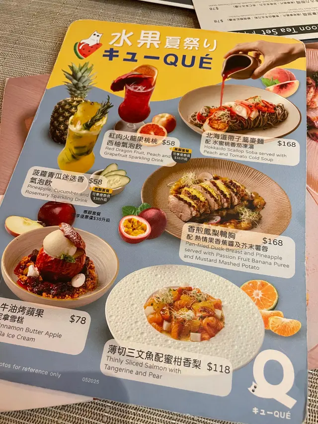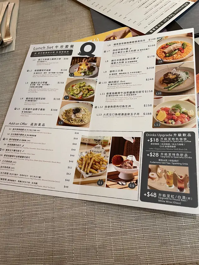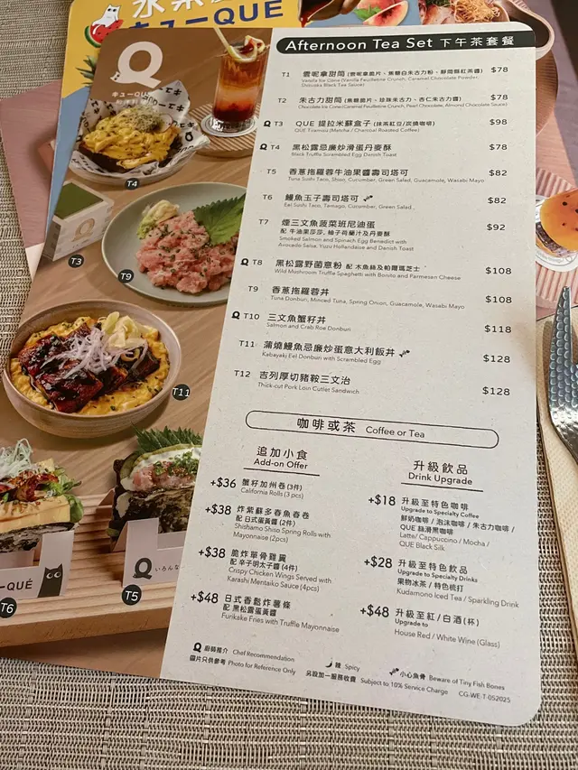 行完寶蓮寺,落番東涌搵食,但响東薈城望下佢果堆餐廳list都唔太啱食咁,响遠處見到好大隻「Q」字,望落似餐廳同唔少人,就行去望下。「QUE」對我嚟講有啲陌生,我响OpenRice見佢都唔少分店,見好多Foodies評分都唔錯就入去試下。店內嘅環境都好乾淨舒適,好優閑嘅感覺。我哋5點入座,除了可以點下午茶餐外,仲可以點午餐。我哋都係揀下午茶餐,我哋分別點咗「黑松露野菌意粉配木魚絲及帕瑪芝士」同「蒲燒鰻魚忌廉炒蛋意大利飯丼」,再加多份跟餐嘅追加小食「日式香鬆炸薯條配黑松露蛋黃醬」。但我發覺點錯嘢,三款嘅菜式都係好「漏」,芝士、忌廉、蛋黃醬!到我打呢篇食評時都成10點幾,但都仲未消化到,認真誇張。雖然好似唔消化咁,但佢三款嘅菜式都好令人回味。「日式香鬆炸薯條配黑松露蛋黃醬」呢個我除咗嫌佢個薯條有啲幼外,我覺得佢個薯條勁正,佢做到好似shake shake薯條咁好香濃同惹味,點上黑松露蛋黃醬,完全係味蕾爆發,令成個薯條嘅味到大大提升,每一條薯條,都要沾滿佢個蛋黃醬先夠滿足,但正正我咁點法,到最後係唔夠醬點!「黑松露野菌意粉配木魚絲及帕瑪芝士」上到菜我誤會咗啲四方粒粒係魚,好少可會將啲菇切到咁大粒,食落好有口感,松露同芝士嘅味道都好突出,意粉嘅軟硬度亦剛好,但我估唔到佢係有啲heavy,我以為好似食齋咁應該冇乜嘢,最後都係食唔落。「蒲燒鰻魚忌廉炒蛋意大利飯丼」好耐冇食過鰻魚,佢有三大塊,燒得好靚同佢個燒汁好均勻,魚遺冇乜骨,加上佢個忌廉炒蛋,將佢同個飯撈埋一亦食係非常完美。佢個飯有加忌廉一齊煮,成件事係邪惡x2,幸好佢將飯煮得creamy之餘,亦煮得效淋身,唔係應該會食到胃痛。另外要讚嘅係佢個小配菜醃蘿蔔,佢不單只爽脆,而且帶有柚子嘅香甜味,連我唔食呢啲嘢嘅人都覺得驚喜。「凍檸檬茶」好多人都會覺得凍檸茶唔係都要講一餐下話!但係我就係覺得佢有啲唔普通,我哋都飲得出佢有種花香嘅味道,好似花茶加上檸檬,我覺得幾特別,好relax嘅感覺。最後埋單301蚊,下午茶嚟講唔算話好平,但佢地都比到應有嘅食物質素,環境衛生同服務等都做得唔錯,我覺得值得再試下佢更多唔同嘅菜式。…查看更多