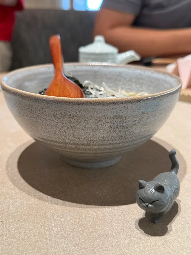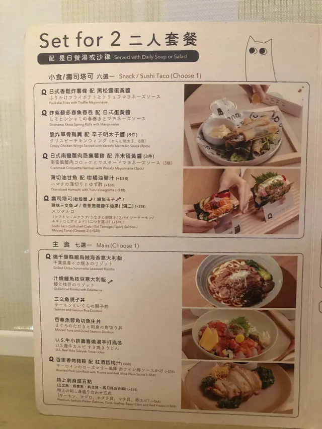 約了朋友到新都會廣場逛街,先吃個午飯才起行,選了這間用猫猫作佈置的日式餐廳。沿著商場的走廊一直往餐廳方向行去,見到一個大大的Q字,一幅很高的猫猫木製裝飾牆映入眼簾,猫顏色全是白式,有不同姿態,平均佈置在木架內,配上綠綠的青草,好看又有趣。餐廳內有不少滕製品的裝置,給人輕鬆放鬆的感覺。餐廳有午市套餐供應,共十五款,款式多樣化,總有一款合心意。套餐包括湯或沙律和餐飲。我們三人選了三款一起分享。餐湯,蘑菇忌廉湯,湯底綿滑,蘑菇味足夠。沙律,沙律菜夠爽甜,伴上日式芝麻醬,開胃,那兩片日式腐皮吸收了汁液,我最喜歡吃。蒜香柚子胡椒蜆肉意粉,蜆肉大小適中,意粉爽口,不過調配的醬汁沒有吃出太多的柚子味,反而像忌廉汁多些。三色魚生丼,三色魚生是三文魚,油甘魚和赤蝦。赤蝦很大隻,蝦肉鮮甜,爽口。三文魚和油甘魚是厚切,入口需咀嚼,不過很爽口,味道鮮美。壽司飯粒粒分明,味道微酸帶甜,夏天吃很開胃。辛口燒明太子冷稻庭烏冬,這菜式擺盤美觀,食材顏色多樣化,未入口也醒神。三大圈燒過的鮮紅明太子,味道不過鹹,入口即化。用來灑上烏冬上的那一小杯三文魚籽杯,像清泉一樣為烏冬添上清新口感,掛上凍凍汁液的鳥冬,入口清新順滑,辛口只有一點點辣度。餐飲選跟餐咖啡,沒有升級轉其他咖啡,我們要熱斎啡,大大杯,不過啡味一般,有點苦澀。如果夏天想吃得清新些,上述兩份冷吃的菜式,我覺得味道都可以。吃飽就逛街去了。…查看更多
