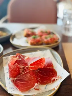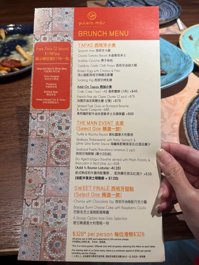 位於中環威靈頓廣場M88❣︎Quiero Más❣︎係一間主打食西班牙🇪🇸菜嘅餐廳,呢到weekend嘅brunch menu $328一位由前菜食到甜點,超級豐富🤤加$198仲可以無限任飲紅白酒🍶啤酒🍻水果酒🍹等等⋯⋯餐廳仲有埋樂手為大家即場表演風琴🎵氣氛超好👍🏻天台仲設有一個露天小型酒吧區,喺到嘆下啤酒🍻同朋友傾吓偈勁chill,今日去嘆lunch,全場滿座,認真厲害👏🏻✿西班牙🇪🇸小食✿(前菜)❣︎西班牙火腿❣︎呢個做前菜好有驚喜🤩肉質油潤,味道濃郁甘香👍🏻❣︎水晶蕃茄多士❣︎多士烤得酥脆,再配搭埋蕃茄蓉,口感清新。❣︎帶子他他❣︎帶子鮮甜細嫩😋👍🏻配上牛油果🥑蓉同青檸🍋🟩做醬汁,層次豐富。❣︎西班牙油蒜大蝦❣︎大蝦超新鮮彈牙😋👍🏻蒜香味濃郁,配搭嘅麵包可以沾埋蒜茸汁來食,好滋味。❣︎流心蛋配西班牙辣腸及脆薯❣︎流心蛋充滿蛋香😋薯條即炸好香口👍🏻加埋西班牙🇪🇸辣腸,超邪惡😈❣︎西班牙烤乳豬❣︎烤乳豬外皮烤至金黃焦脆😋乳豬軟嫩多汁,甘香唔油膩。❣︎法國芬迪克萊爾生蠔(2隻)❣︎➕$78生蠔🦪肉質鮮甜,彈性爽口。✿西班牙🇪🇸主菜✿❣︎海鱸魚配嫩菠菜及白酒忌廉汁❣︎海鱸魚煎得金黃酥脆,魚皮微脆,肉質鮮嫩帶甘甜。❣︎乾式熟成和牛腹肉配薯蓉,配西蘭花苗及紅酒汁❣︎➕$38⭐️必食推薦😋👍🏻和牛腹肉有極度濃郁嘅和牛風味🤤鮮嫩多汁,口感勁軟嫩,食唔停口。✿西班牙🇪🇸甜品✿❣︎西班牙油條配巧克力❣︎油條炸得外酥內軟,配埋香甜嘅朱古力醬,甜而不膩。❣︎開心果意大利雪糕❣︎濃郁嘅果仁香氣😋👍🏻雪糕口感綿密,質地滑順。…查看更多